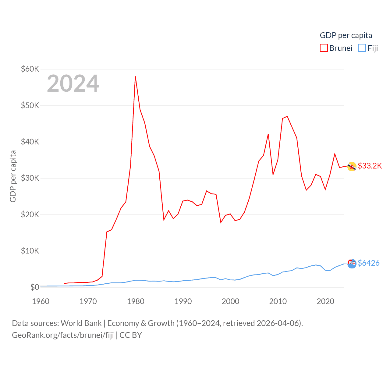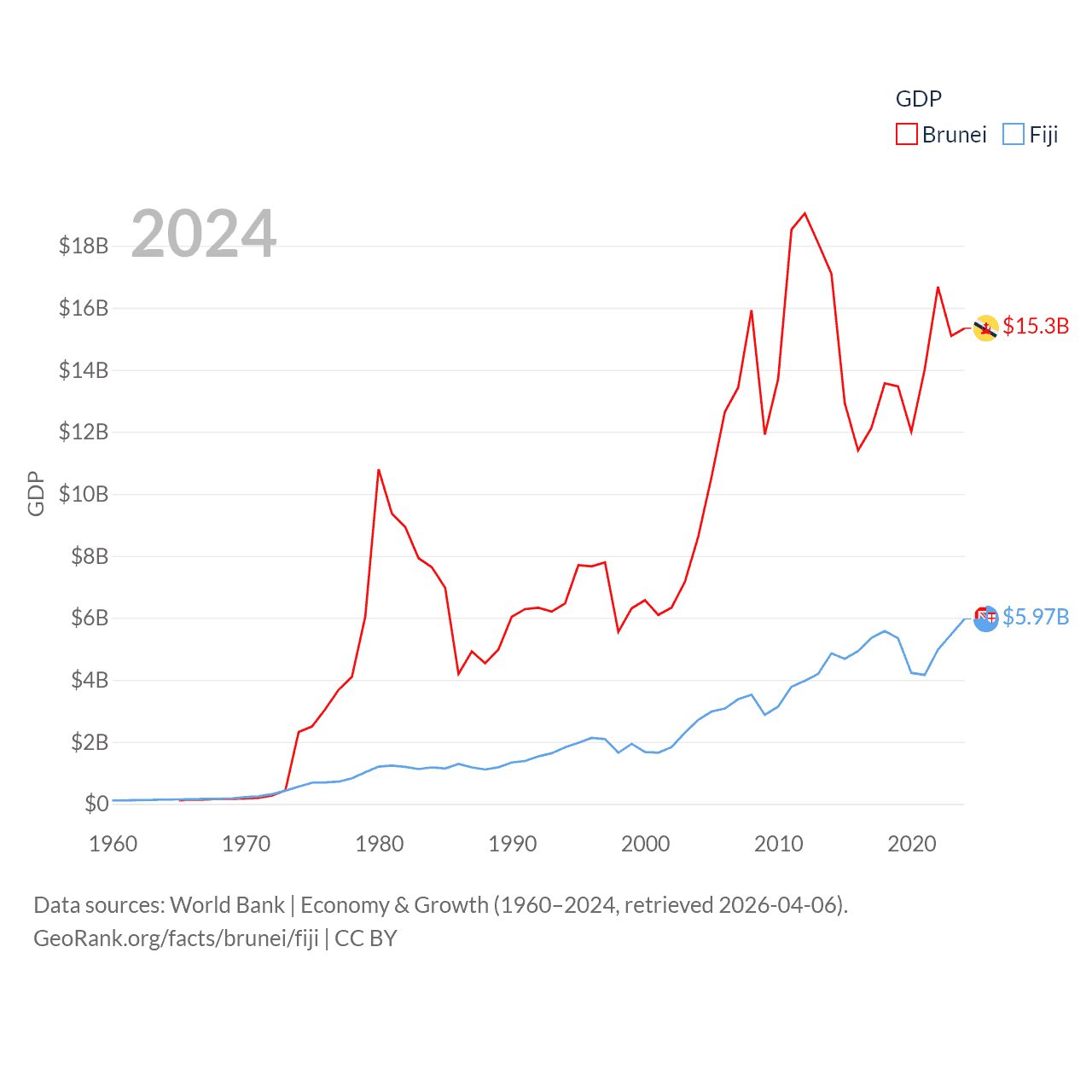 By GDP, Brunei ranks 142/197 ($15.3B) and Fiji ranks 161/197 ($5.97B). By GDP per capita, Brunei ranks 36/197 ($33,153), while Fiji ranks 108/197 ($6,426).