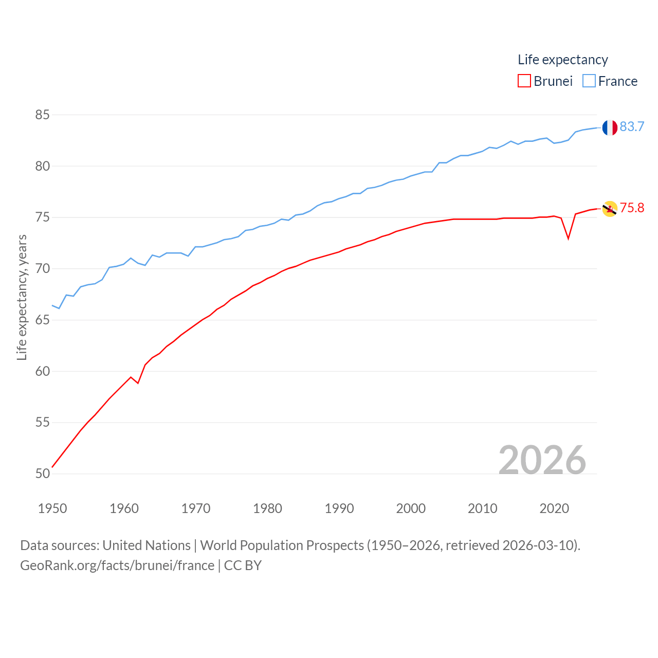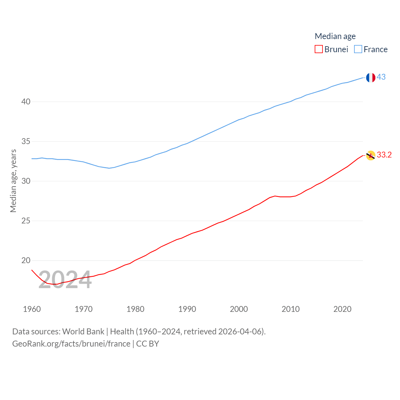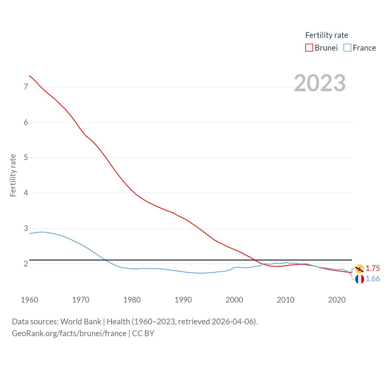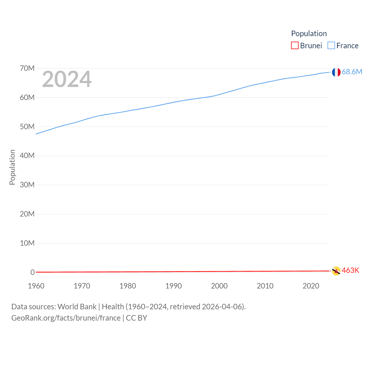 Brunei has a population of 463K (ranked 170/197), compared with 68.6M in France (ranked 23/197). Brunei's land area is 2,035 sq mi versus 208,090 sq mi for France (ranked 165th vs. 48th).