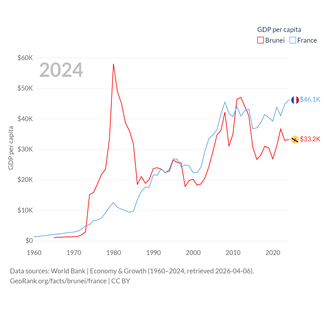 By GDP, Brunei ranks 142/197 ($15.3B) and France ranks 7/197 ($3.16T). By GDP per capita, Brunei ranks 36/197 ($33,153), while France ranks 27/197 ($46,103).