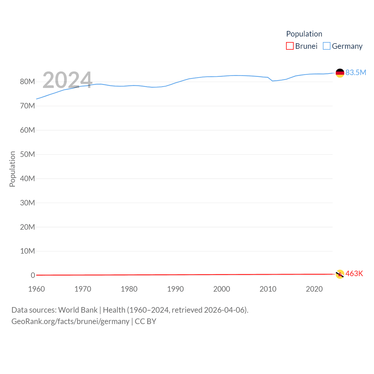 Brunei has a population of 463K (ranked 170/197), compared with 83.5M in Germany (ranked 19/197). Brunei's land area is 2,035 sq mi versus 134,916 sq mi for Germany (ranked 165th vs. 63rd).