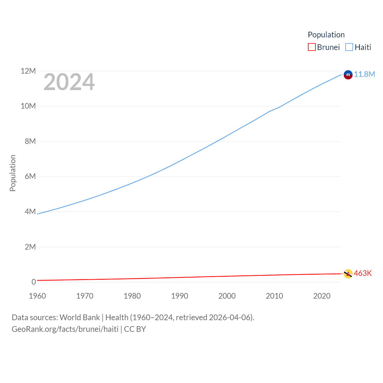 Brunei has a population of 463K (ranked 170/197), compared with 11.8M in Haiti (ranked 83/197). Brunei's land area is 2,035 sq mi versus 10,641 sq mi for Haiti (ranked 165th vs. 142nd).