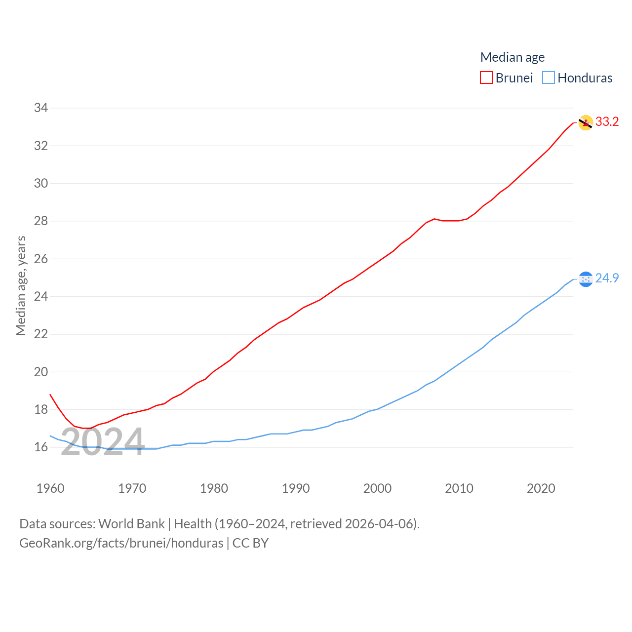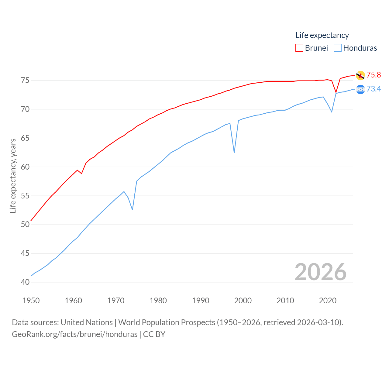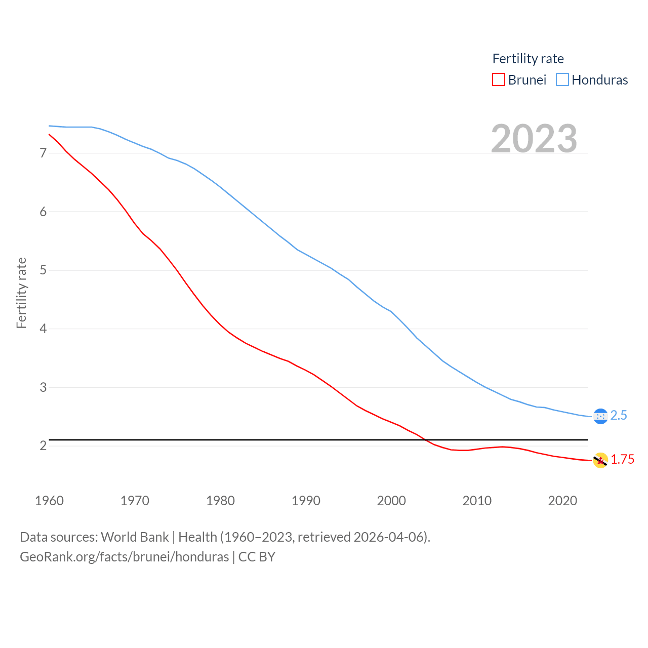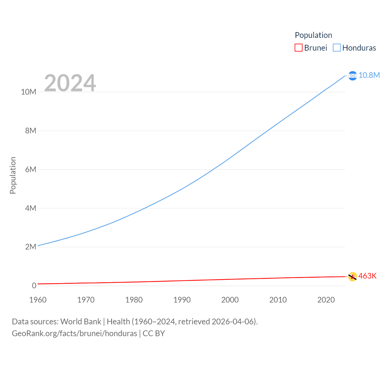 Brunei has a population of 463K (ranked 170/197), compared with 10.8M in Honduras (ranked 89/197). Brunei's land area is 2,035 sq mi versus 43,201 sq mi for Honduras (ranked 165th vs. 100th).