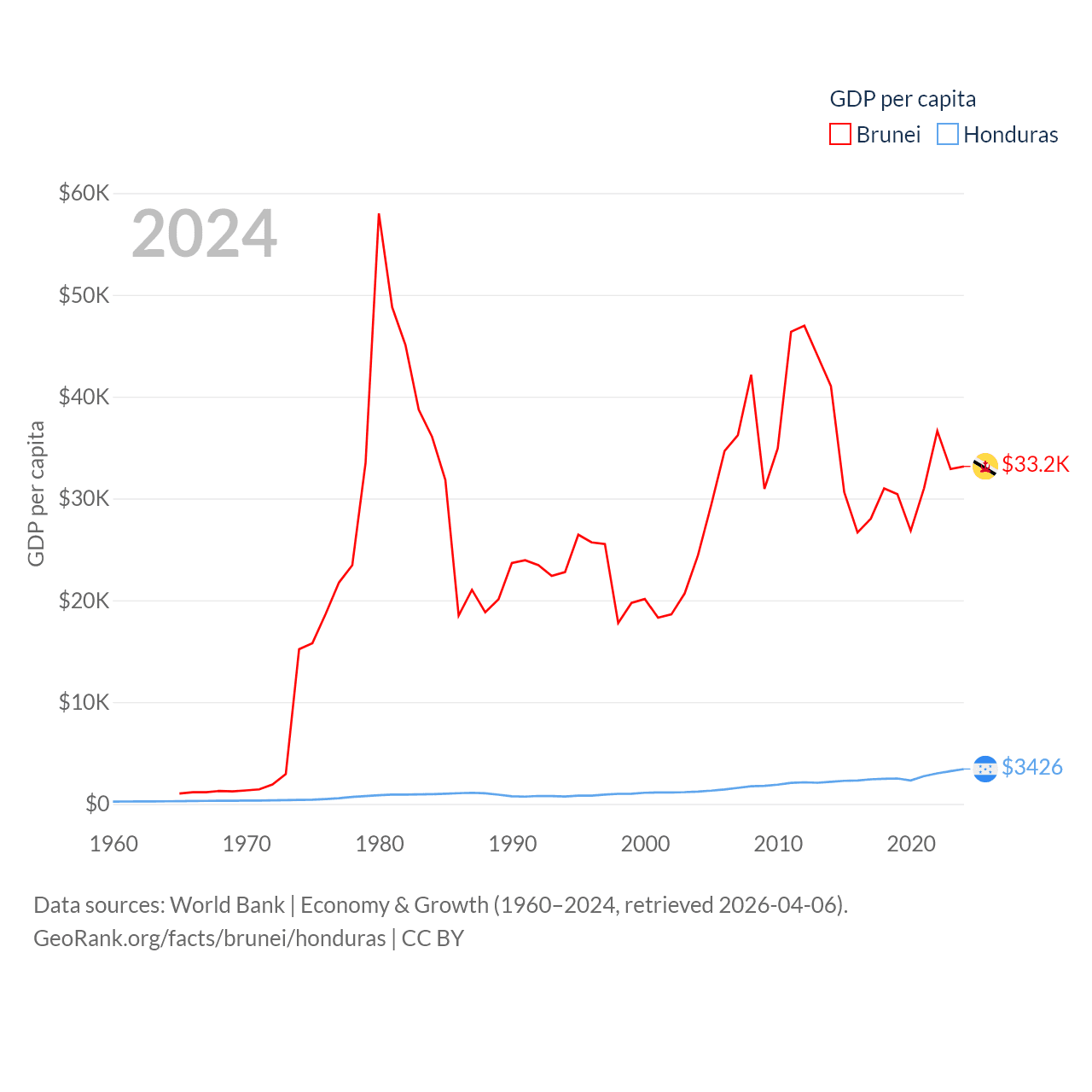 By GDP, Brunei ranks 142/197 ($15.3B) and Honduras ranks 104/197 ($37.1B). By GDP per capita, Brunei ranks 36/197 ($33,153), while Honduras ranks 136/197 ($3,426).