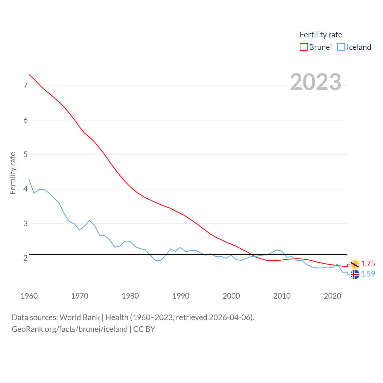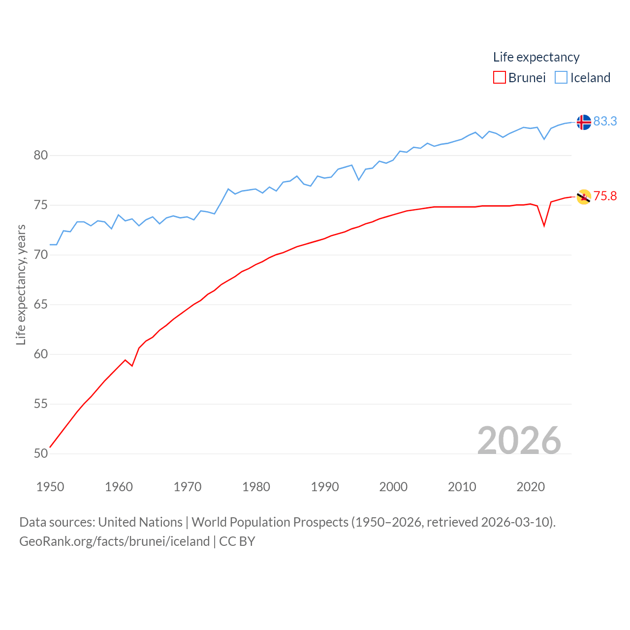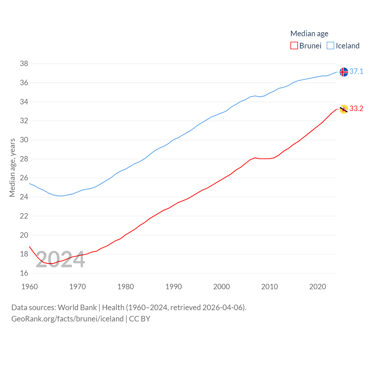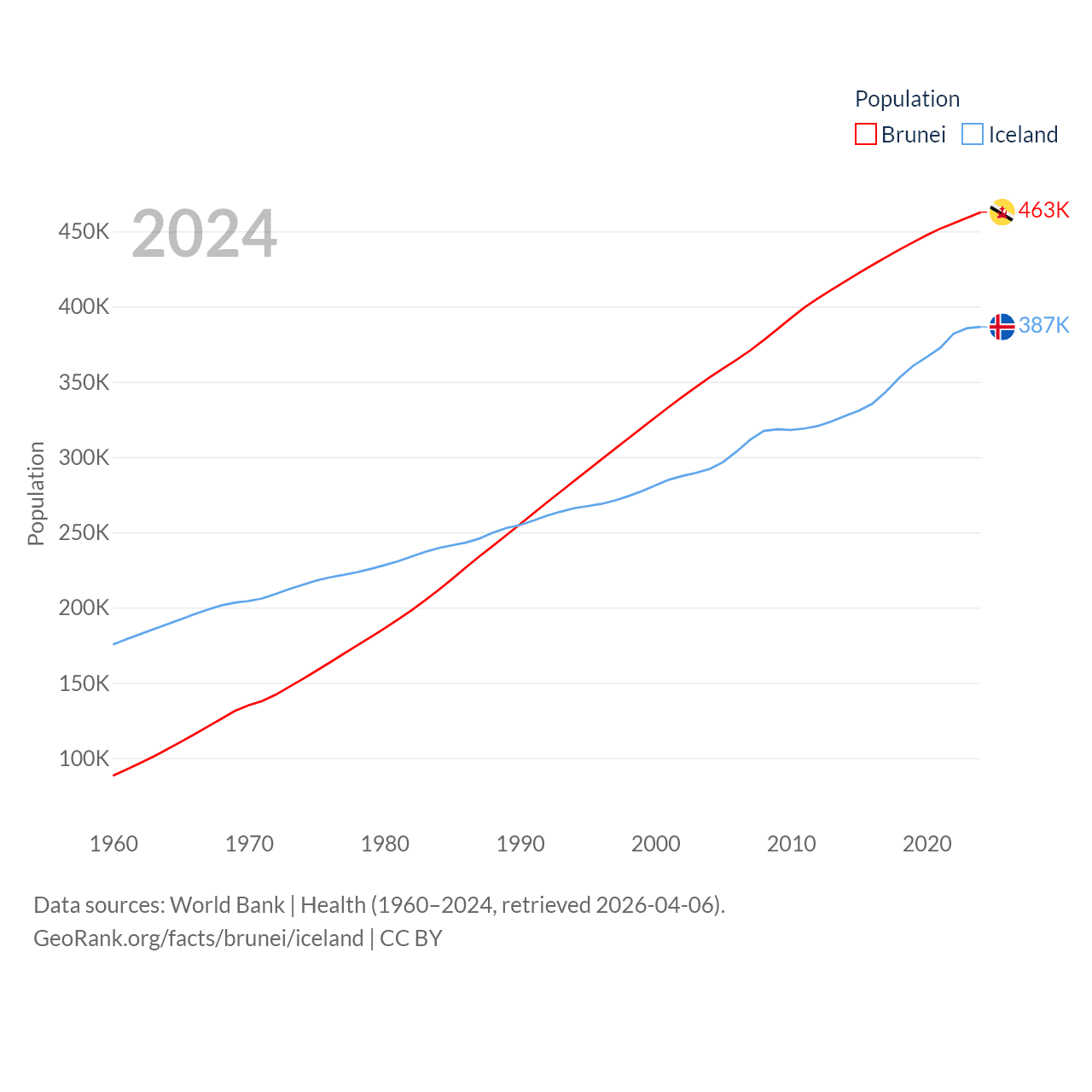 Brunei has a population of 463K (ranked 170/197), compared with 387K in Iceland (ranked 173/197). Brunei's land area is 2,035 sq mi versus 38,931 sq mi for Iceland (ranked 165th vs. 104th).