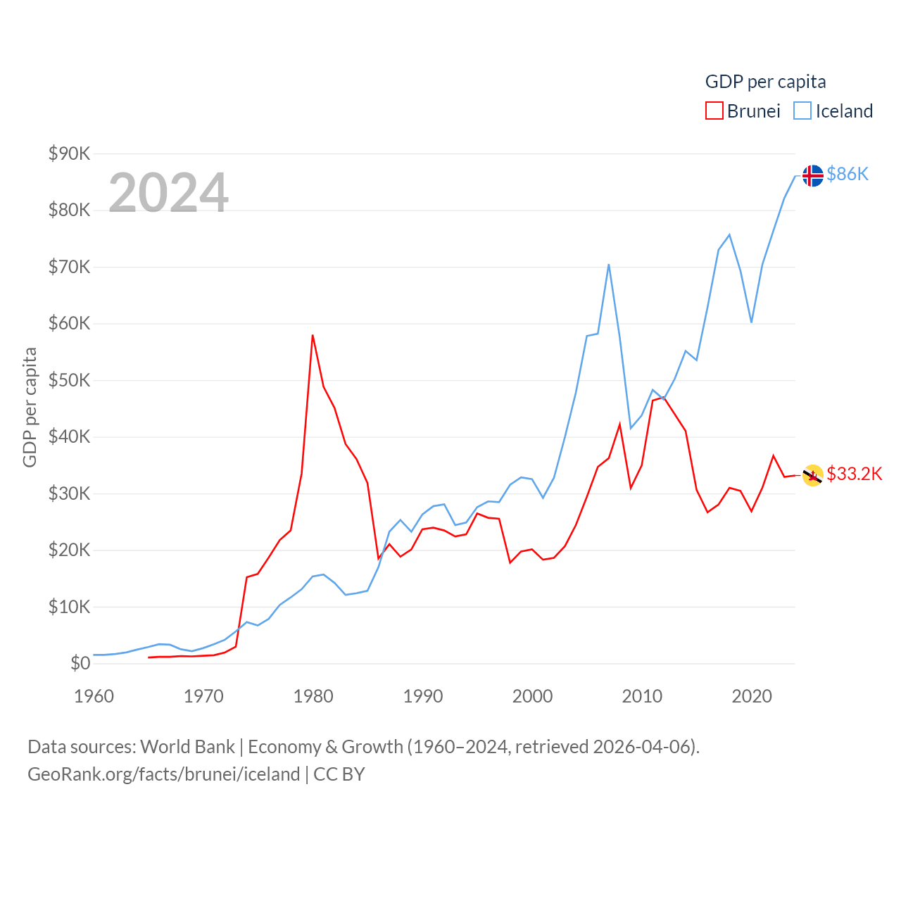 By GDP, Brunei ranks 142/197 ($15.3B) and Iceland ranks 108/197 ($33.3B). By GDP per capita, Brunei ranks 36/197 ($33,153), while Iceland ranks 9/197 ($86,041).