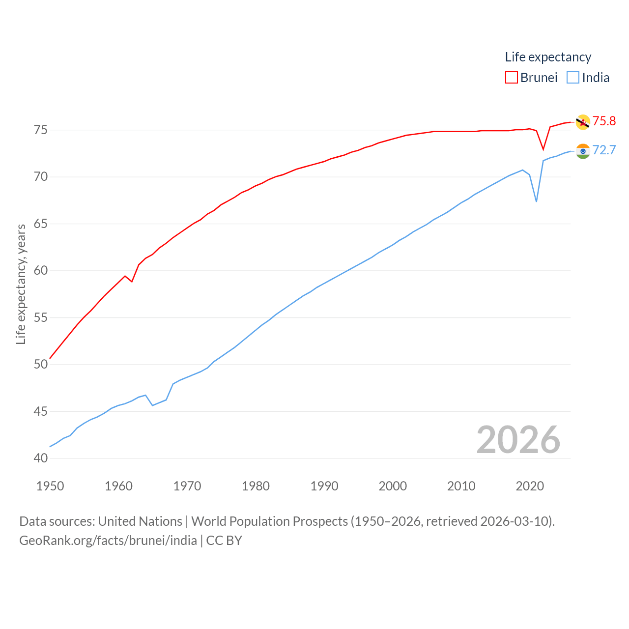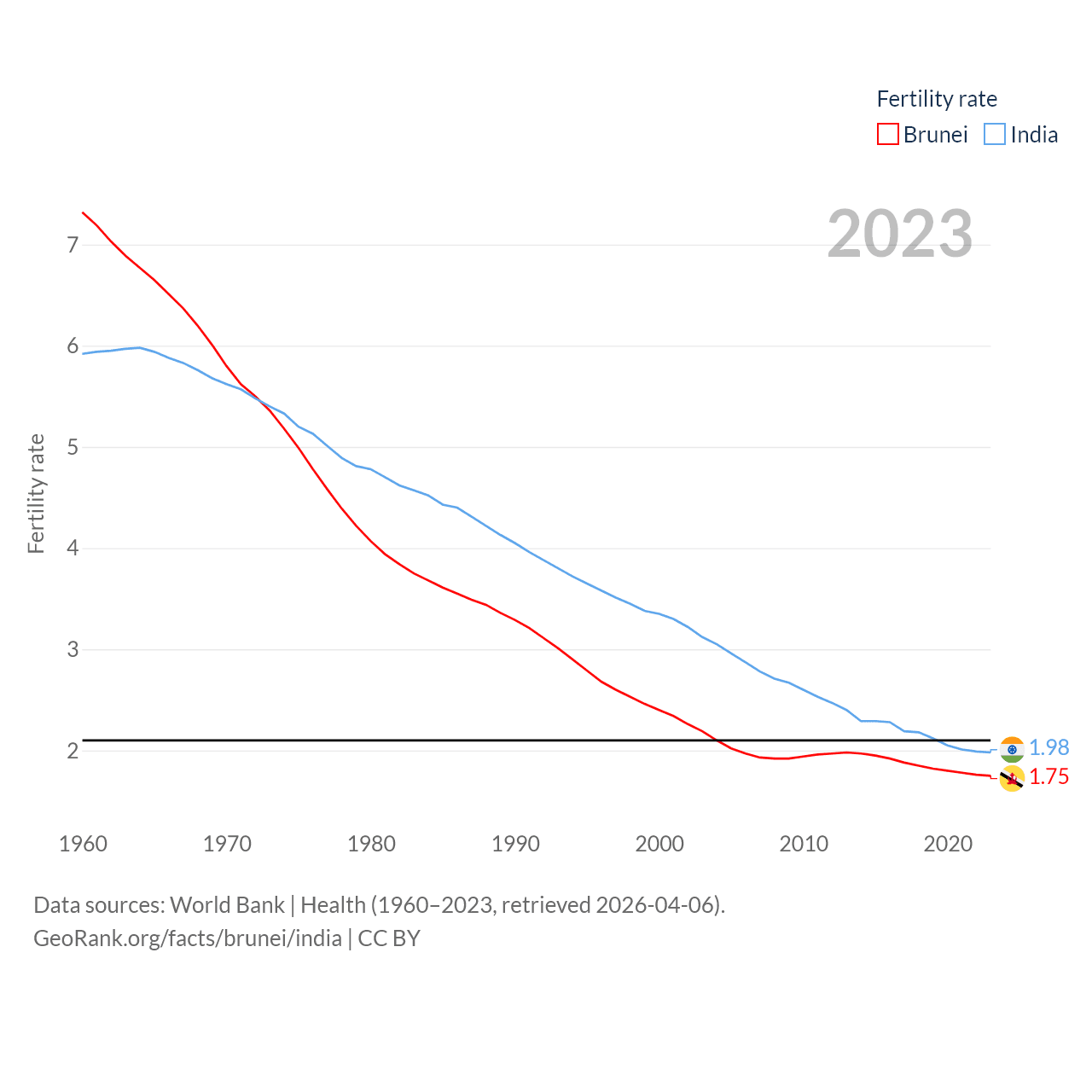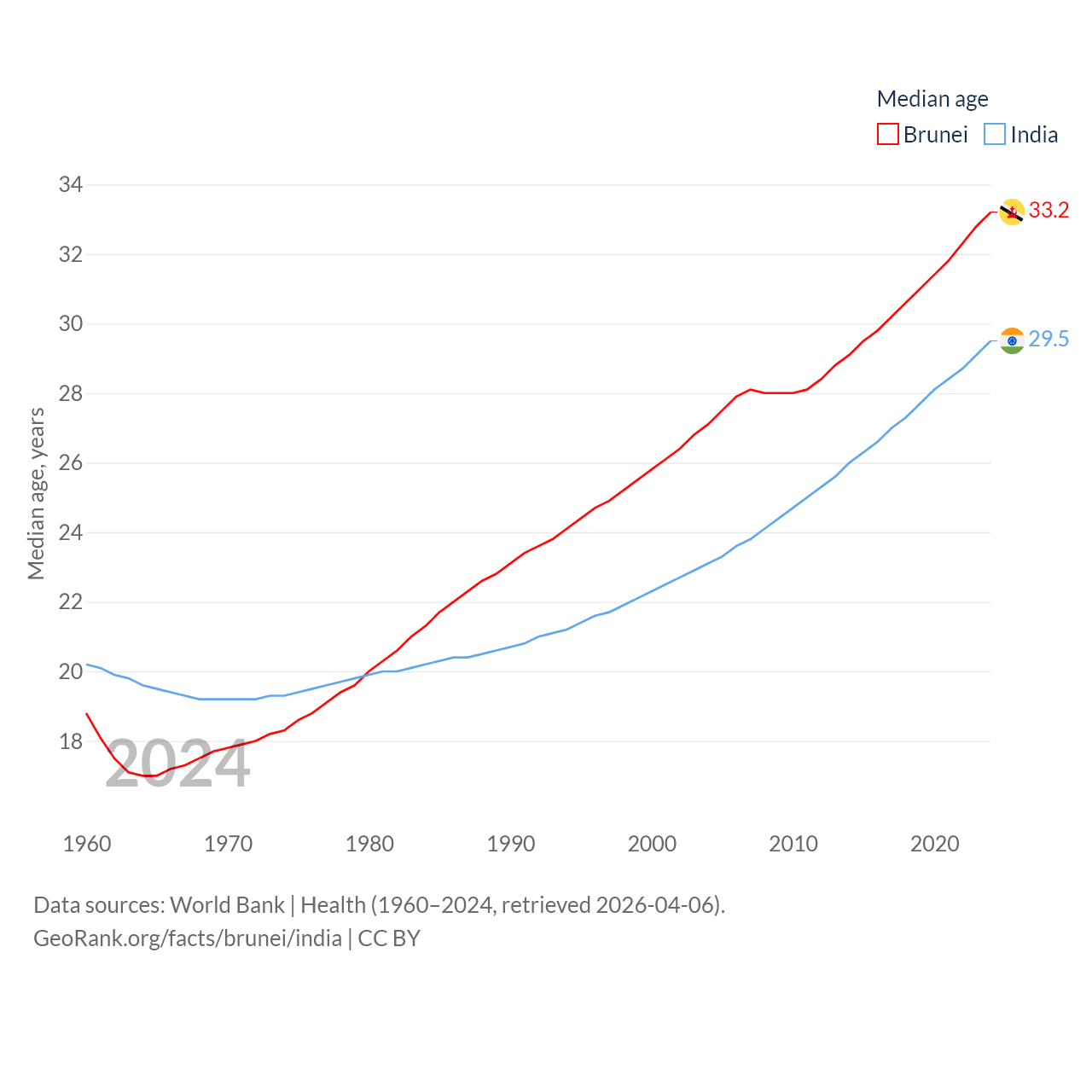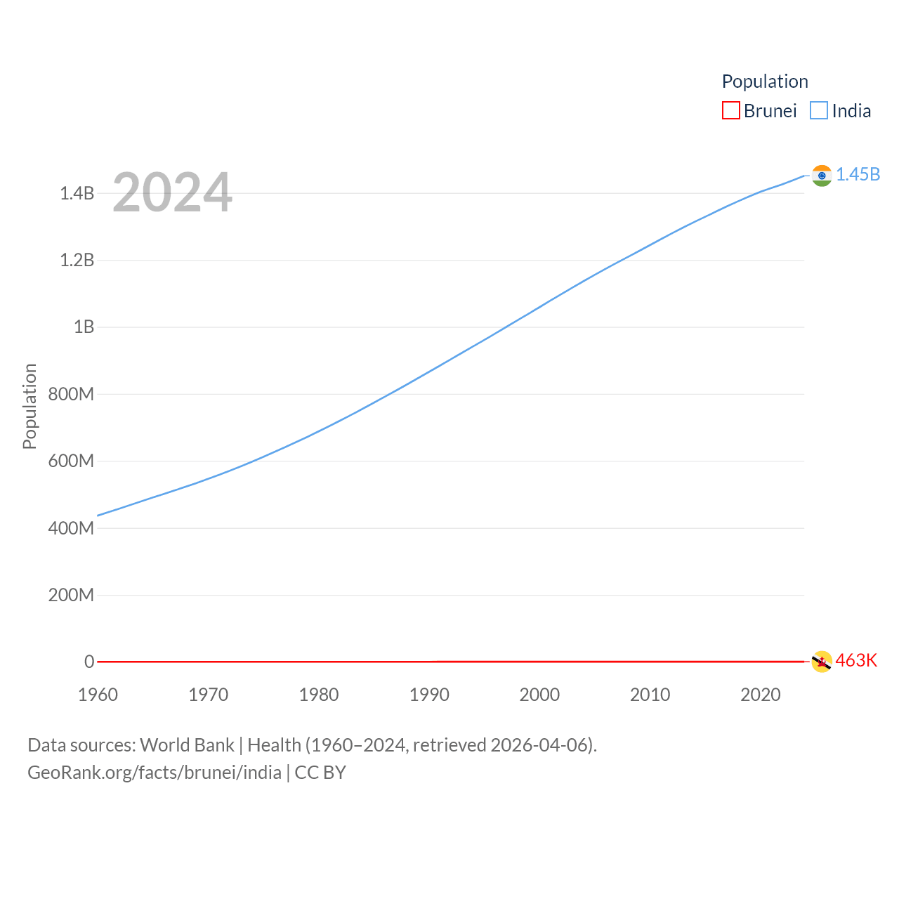 Brunei has a population of 463K (ranked 170/197), compared with 1.45B in India (ranked 1/197). Brunei's land area is 2,035 sq mi versus 1,147,955 sq mi for India (ranked 165th vs. 7th).