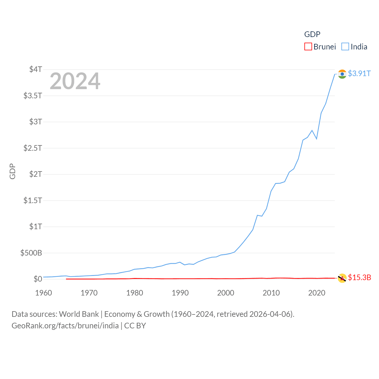 By GDP, Brunei ranks 142/197 ($15.3B) and India ranks 5/197 ($3.91T). By GDP per capita, Brunei ranks 36/197 ($33,153), while India ranks 143/197 ($2,695).