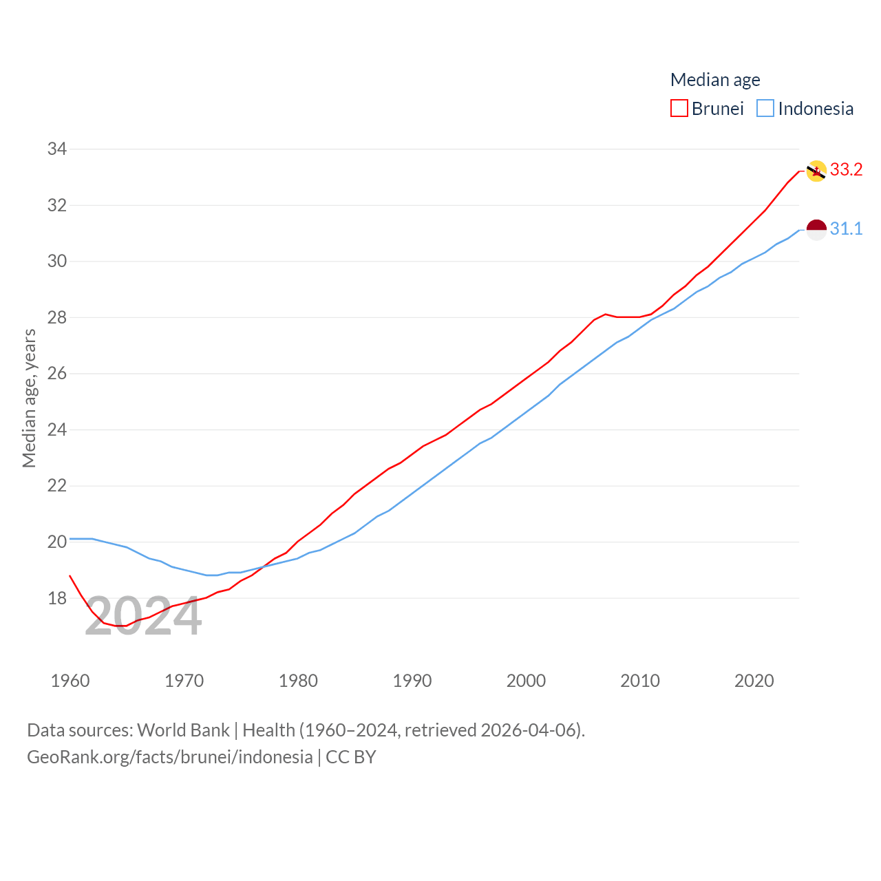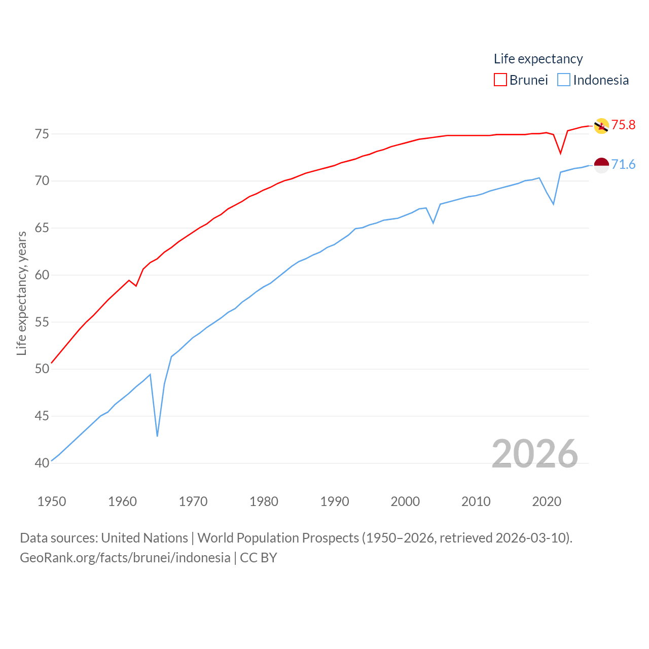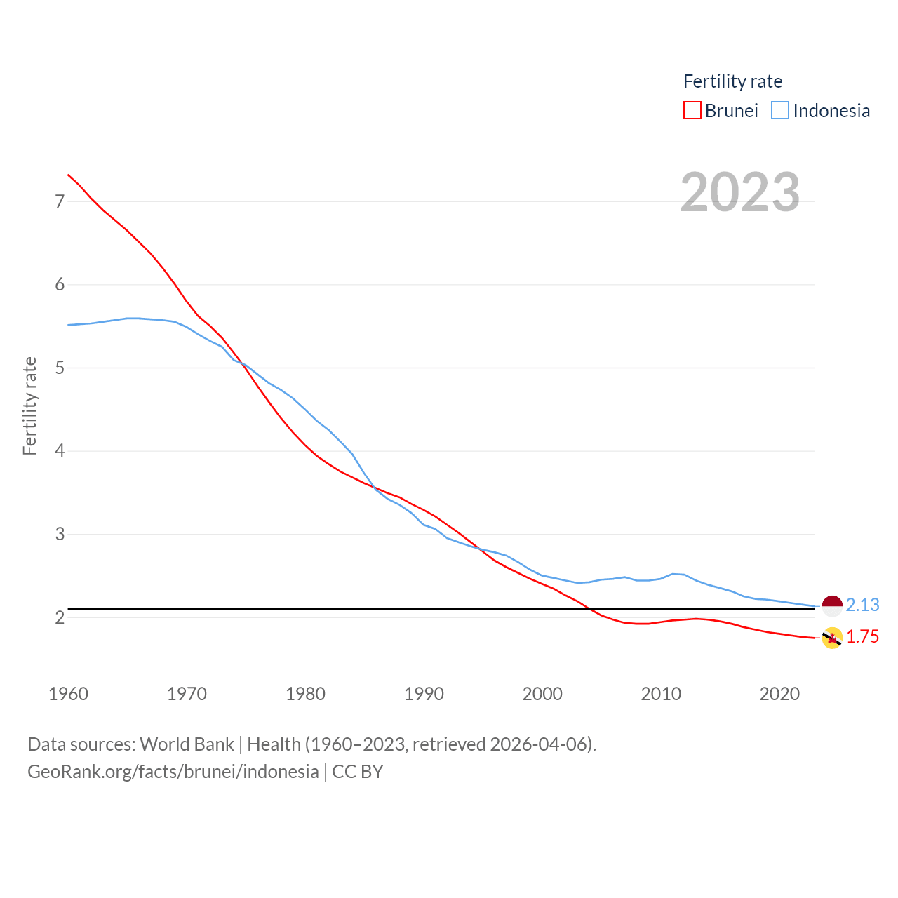 Brunei has a population of 463K (ranked 170/197), compared with 283M in Indonesia (ranked 4/197). Brunei's land area is 2,035 sq mi versus 730,720 sq mi for Indonesia (ranked 165th vs. 14th).
