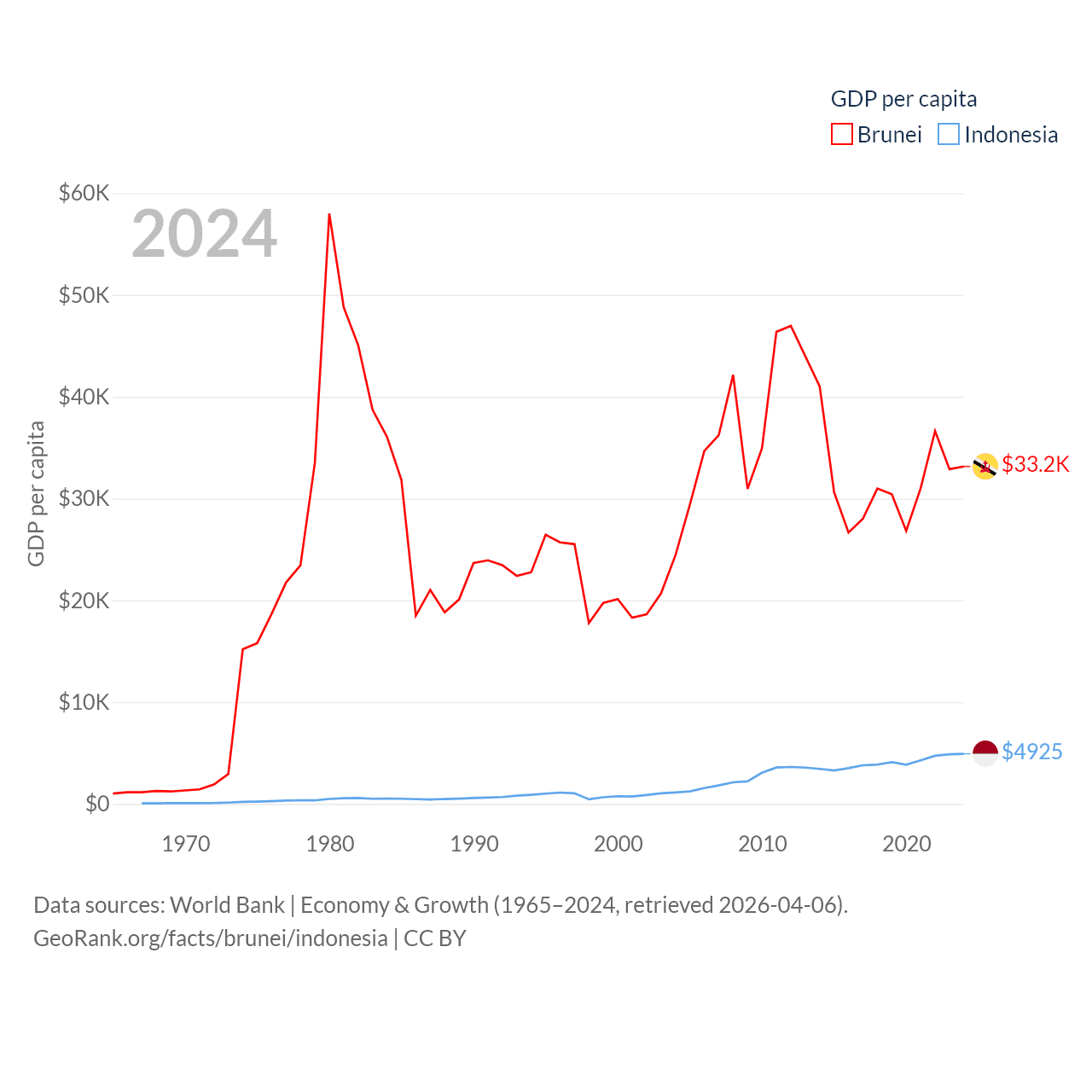 By GDP, Brunei ranks 142/197 ($15.3B) and Indonesia ranks 16/197 ($1.4T). By GDP per capita, Brunei ranks 36/197 ($33,153), while Indonesia ranks 121/197 ($4,925).