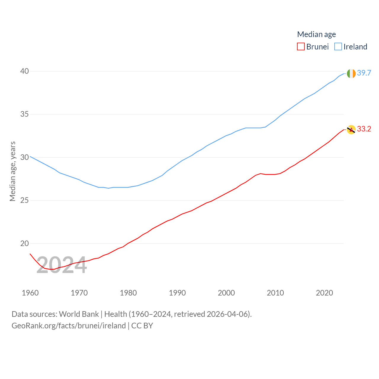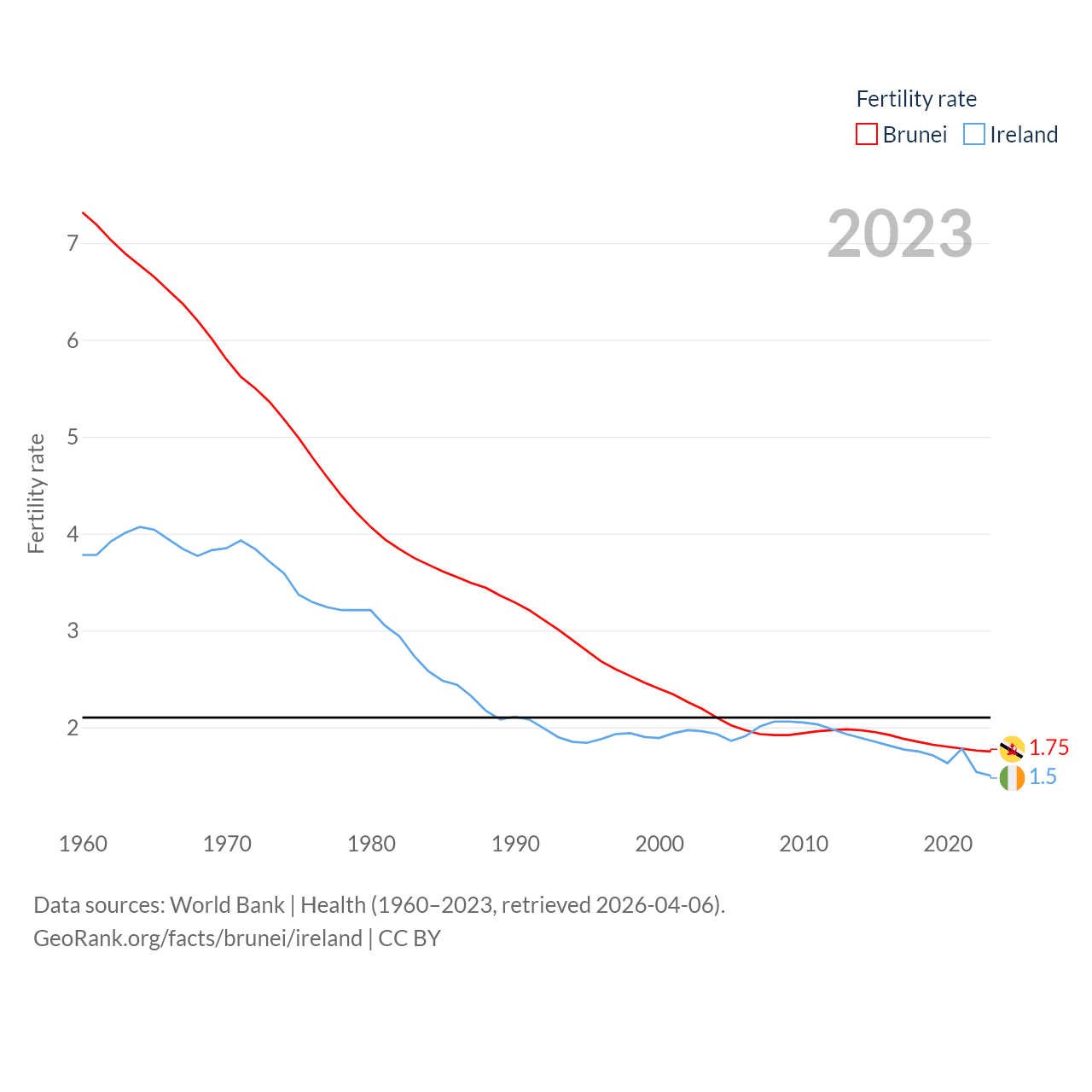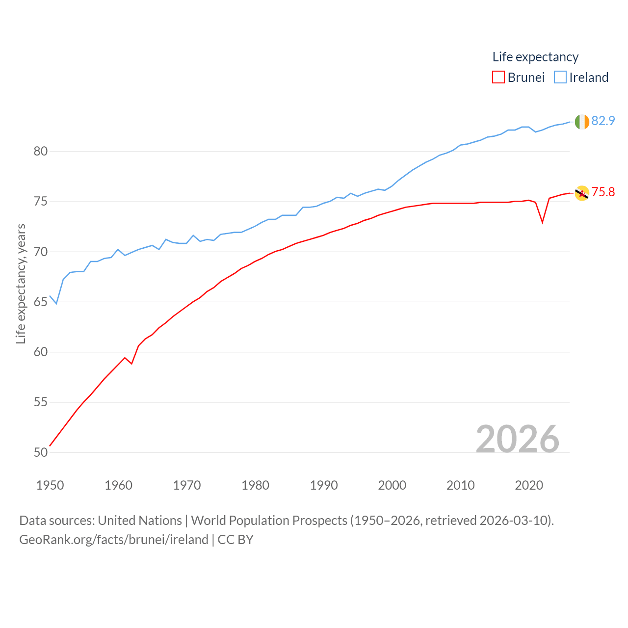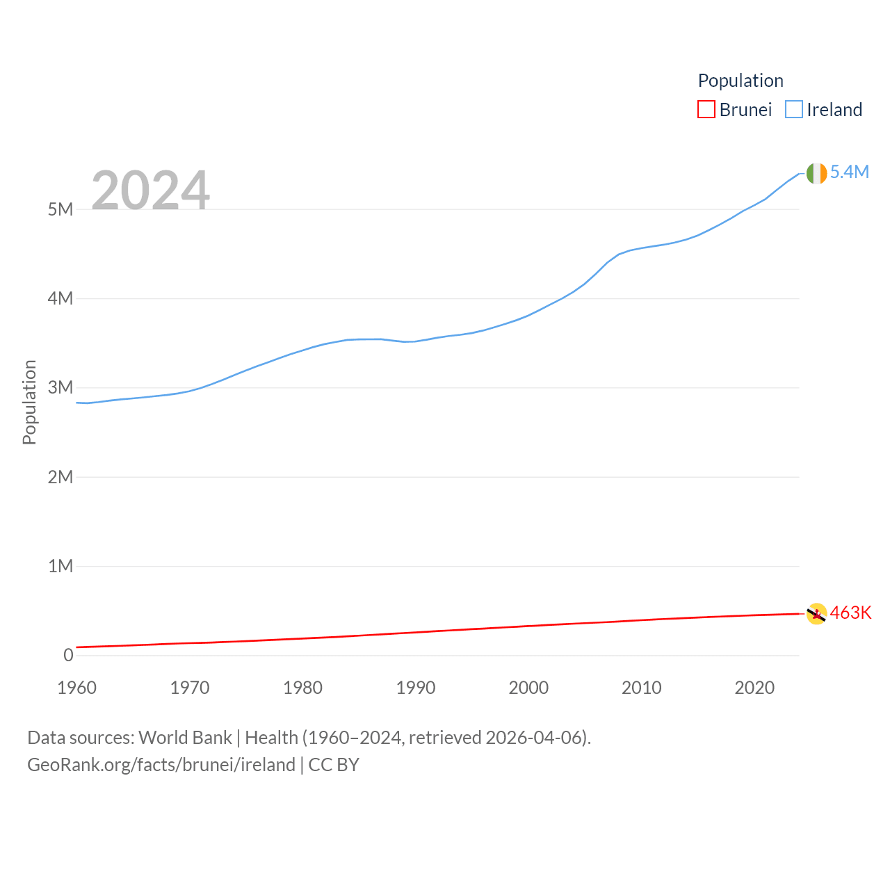 Brunei has a population of 463K (ranked 170/197), compared with 5.4M in Ireland (ranked 120/197). Brunei's land area is 2,035 sq mi versus 26,599 sq mi for Ireland (ranked 165th vs. 119th).
