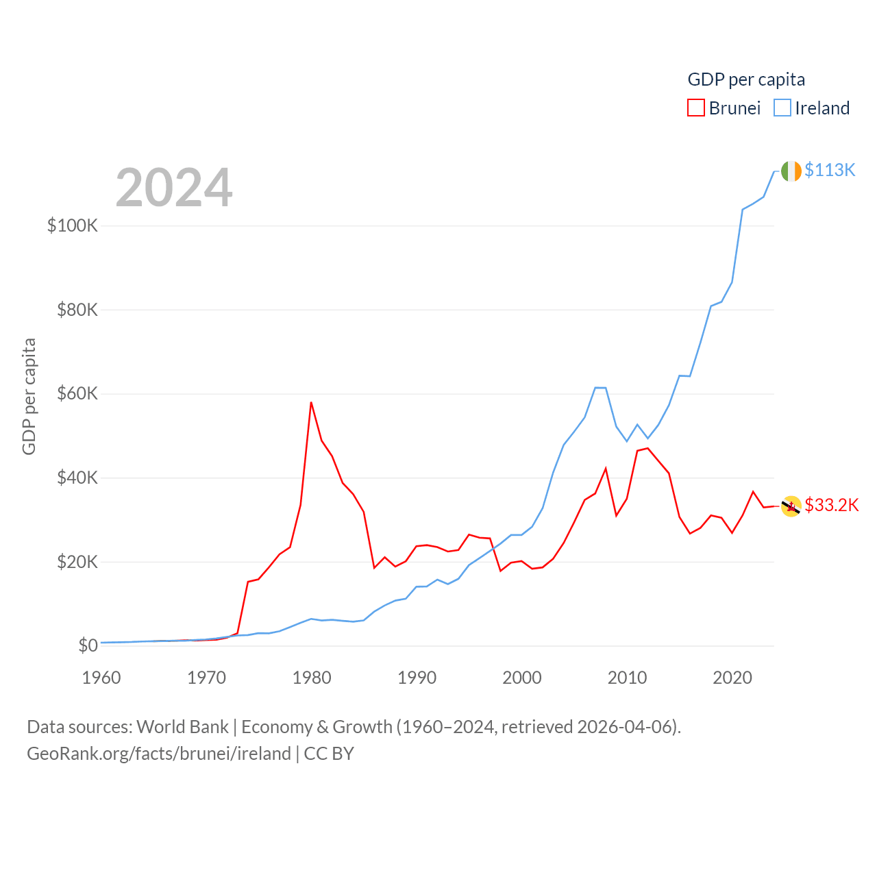 By GDP, Brunei ranks 142/197 ($15.3B) and Ireland ranks 25/197 ($609B). By GDP per capita, Brunei ranks 36/197 ($33,153), while Ireland ranks 4/197 ($112,895).