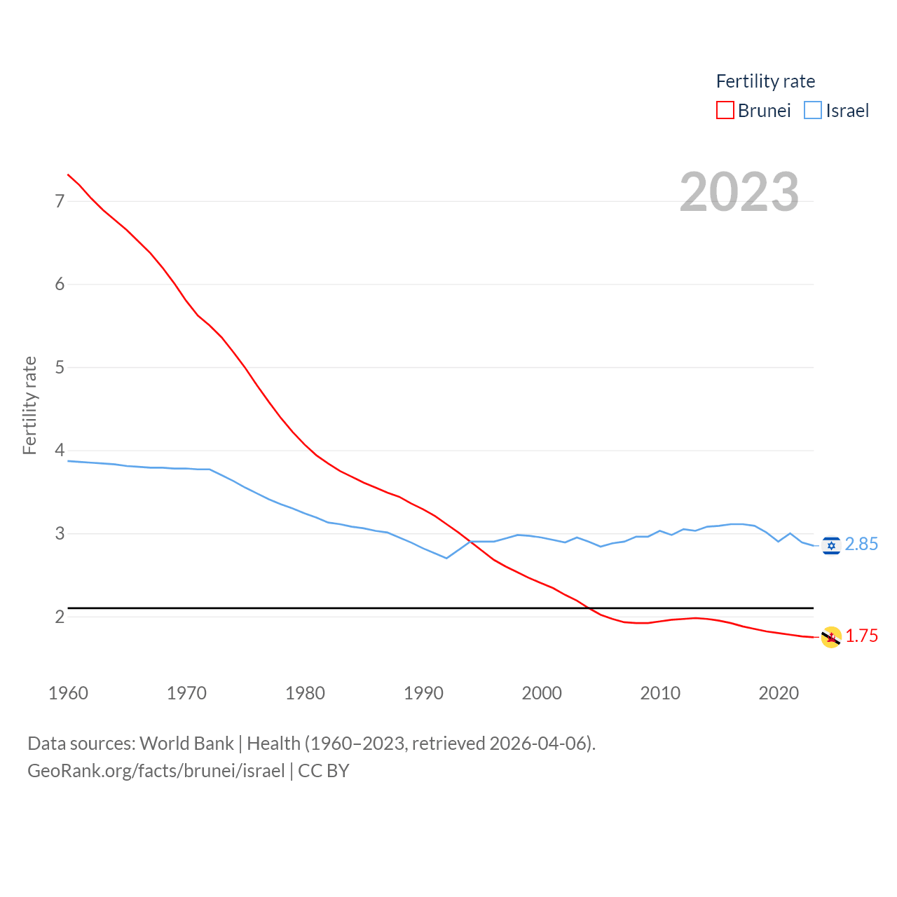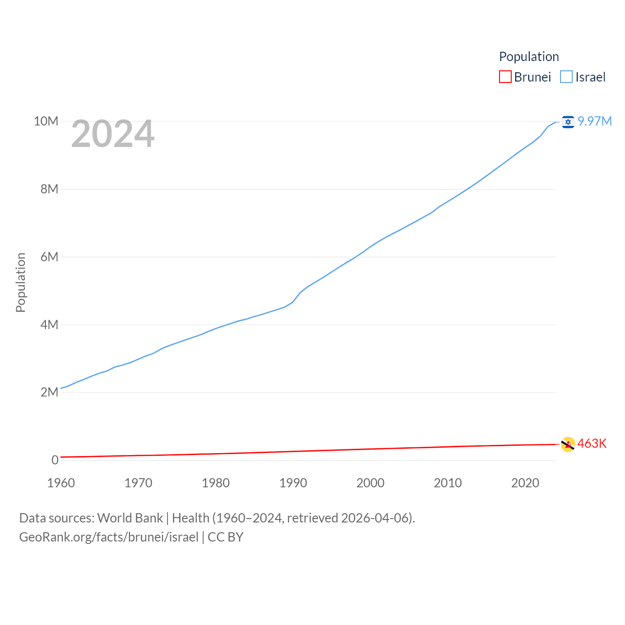 Brunei has a population of 463K (ranked 170/197), compared with 9.97M in Israel (ranked 96/197). Brunei's land area is 2,035 sq mi versus 8,355 sq mi for Israel (ranked 165th vs. 149th).