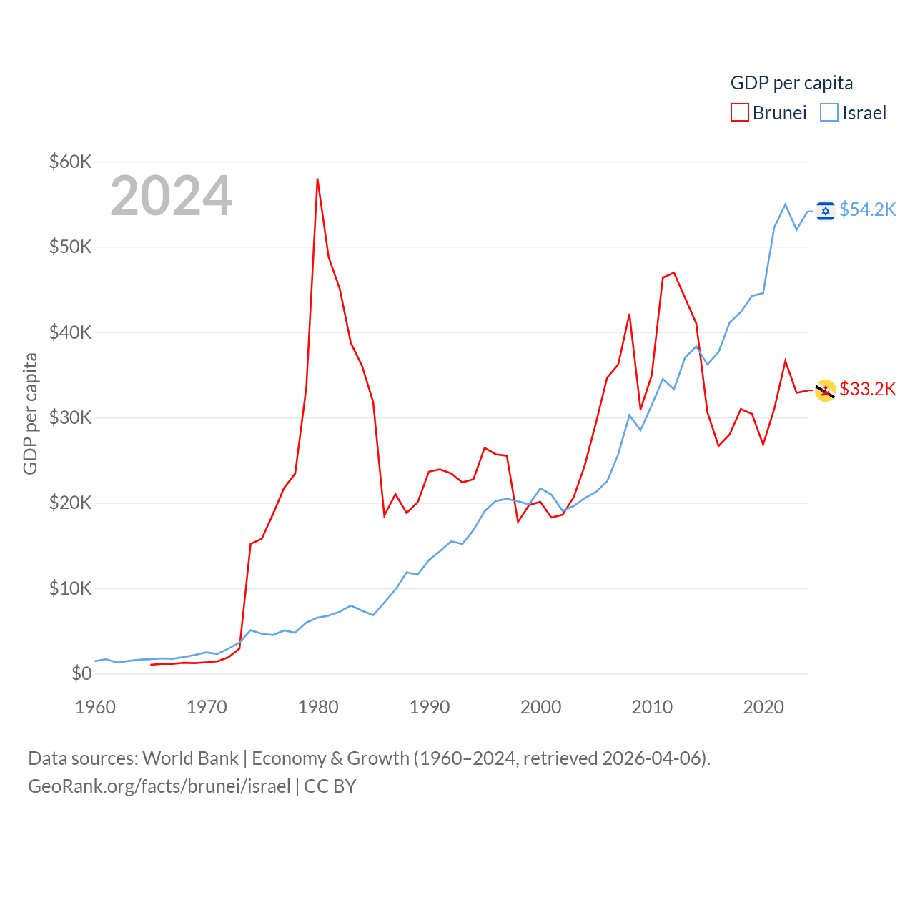By GDP, Brunei ranks 142/197 ($15.3B) and Israel ranks 29/197 ($540B). By GDP per capita, Brunei ranks 36/197 ($33,153), while Israel ranks 21/197 ($54,177).