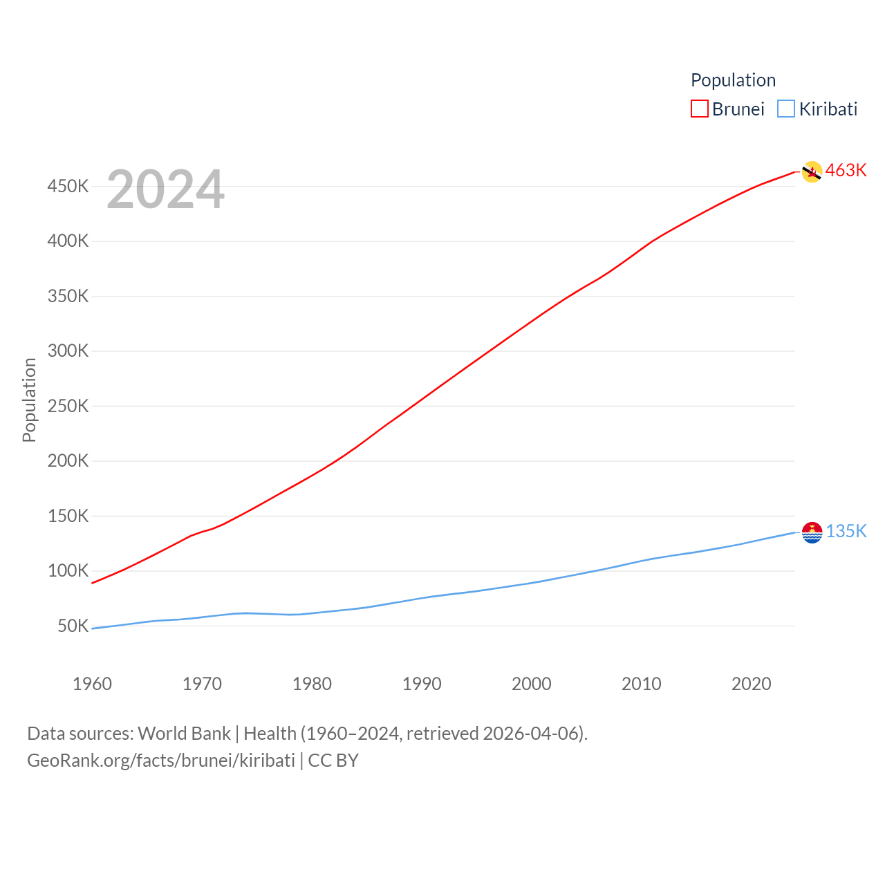 Brunei has a population of 463K (ranked 170/197), compared with 135K in Kiribati (ranked 180/197). Brunei's land area is 2,035 sq mi versus 313 sq mi for Kiribati (ranked 165th vs. 173rd).