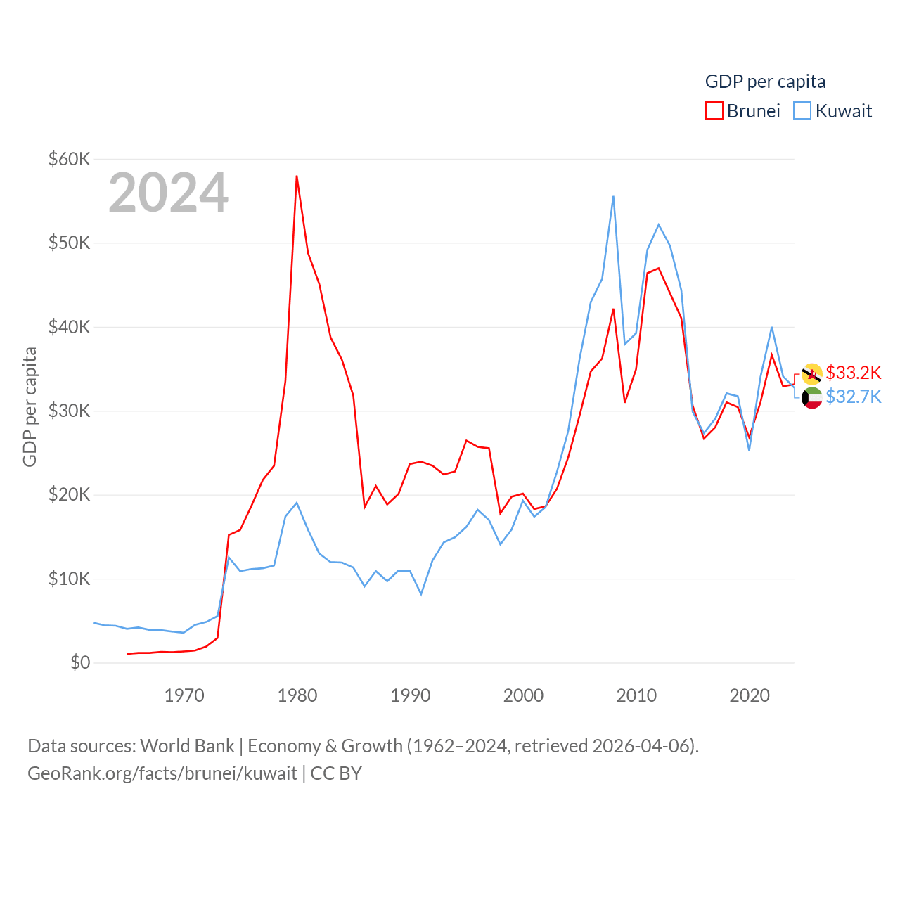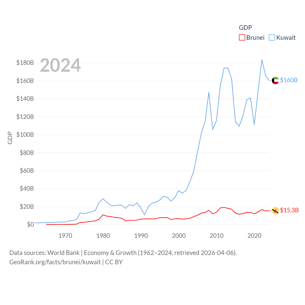 By GDP, Brunei ranks 142/197 ($15.3B) and Kuwait ranks 59/197 ($160B). By GDP per capita, Brunei ranks 36/197 ($33,153), while Kuwait ranks 37/197 ($32,718).