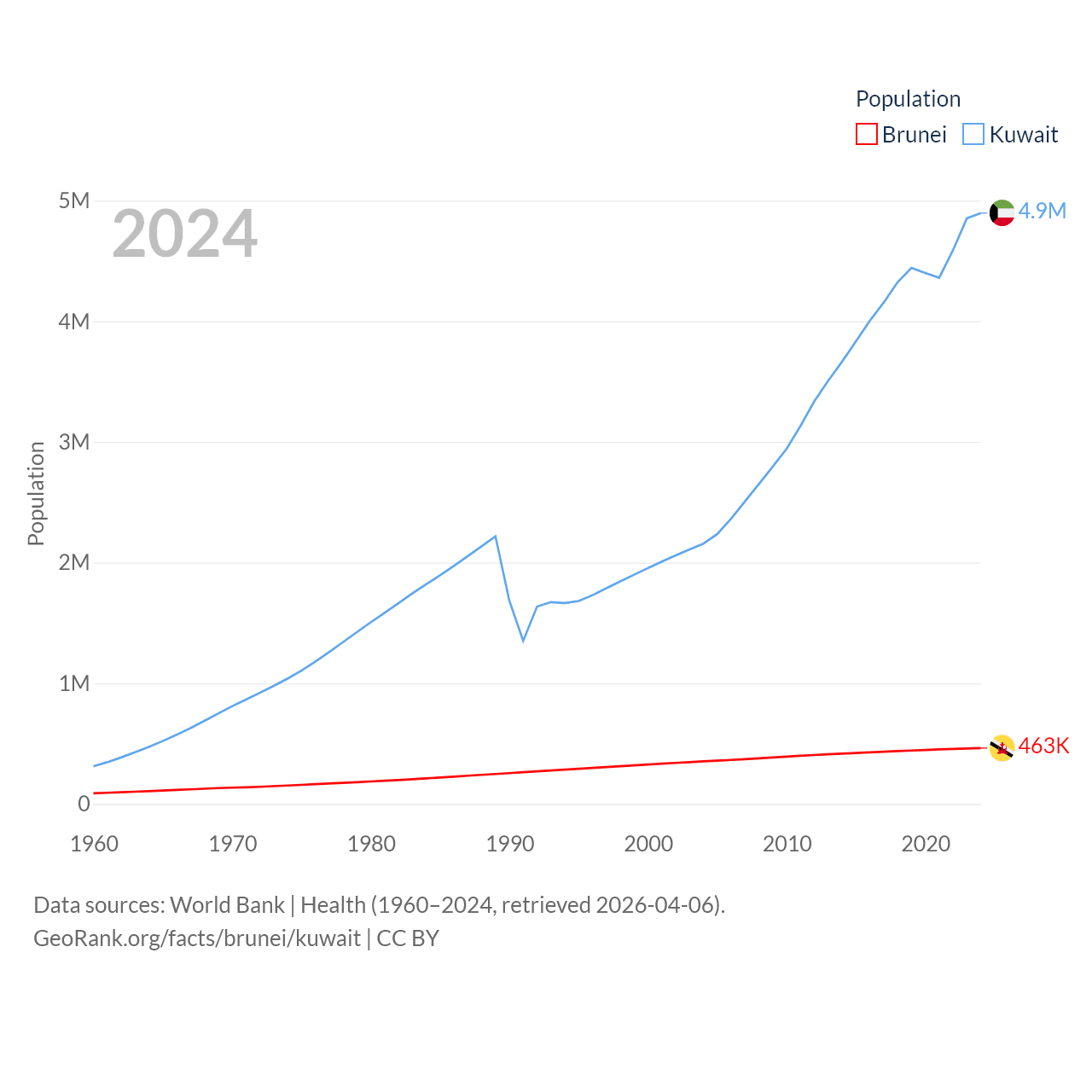 Brunei has a population of 463K (ranked 170/197), compared with 4.9M in Kuwait (ranked 127/197). Brunei's land area is 2,035 sq mi versus 6,880 sq mi for Kuwait (ranked 165th vs. 153rd).