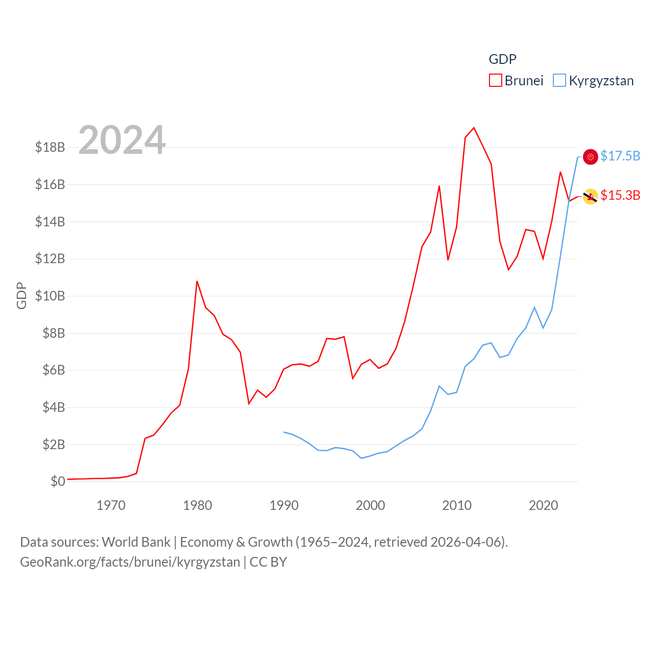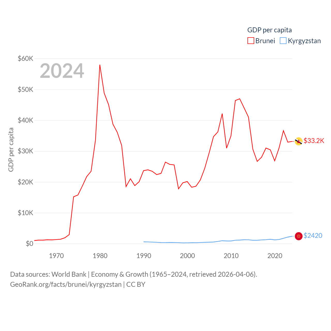 By GDP, Brunei ranks 142/197 ($15.3B) and Kyrgyzstan ranks 135/197 ($17.5B). By GDP per capita, Brunei ranks 36/197 ($33,153), while Kyrgyzstan ranks 150/197 ($2,420).