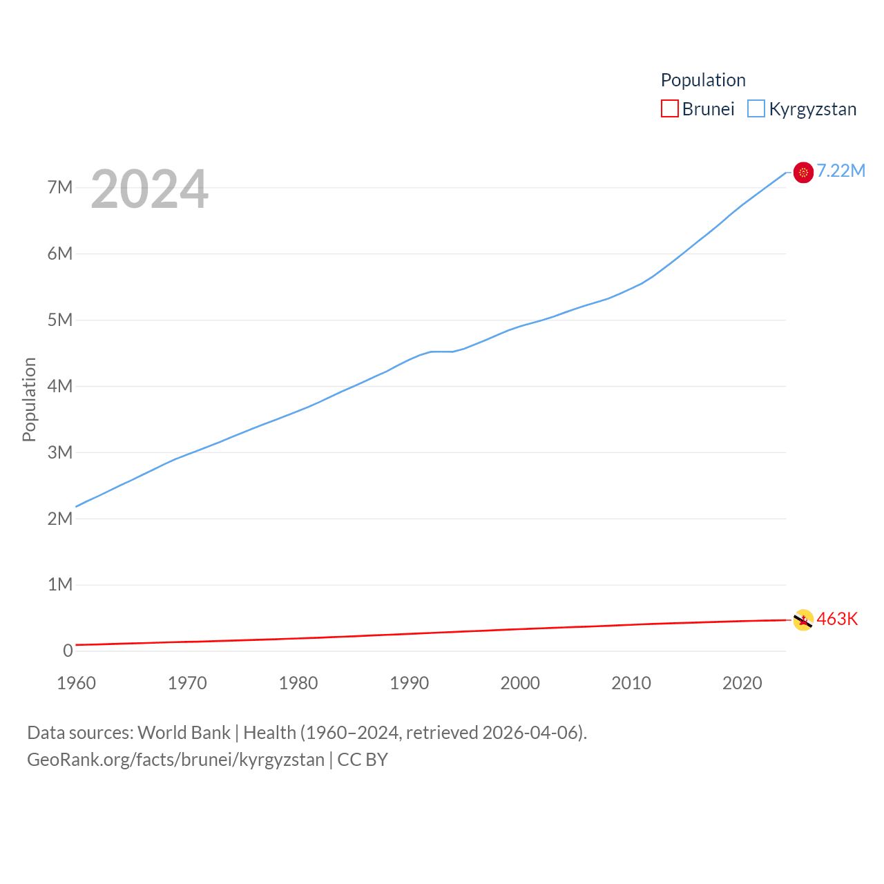 Brunei has a population of 463K (ranked 170/197), compared with 7.22M in Kyrgyzstan (ranked 106/197). Brunei's land area is 2,035 sq mi versus 74,054 sq mi for Kyrgyzstan (ranked 165th vs. 86th).
