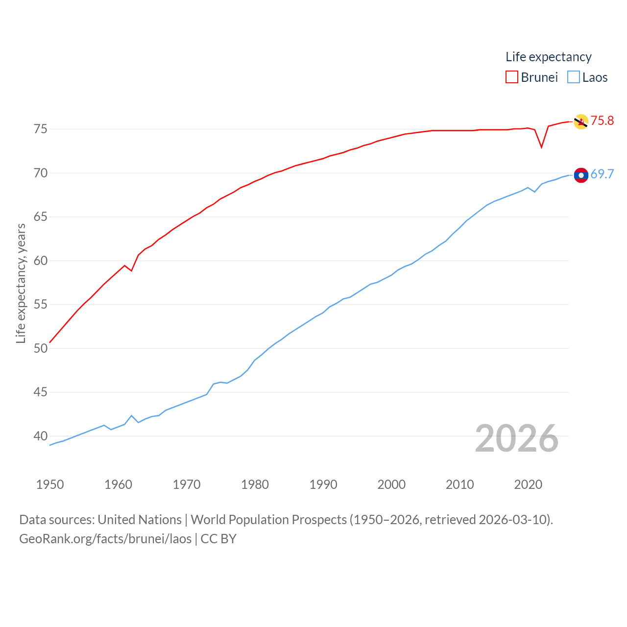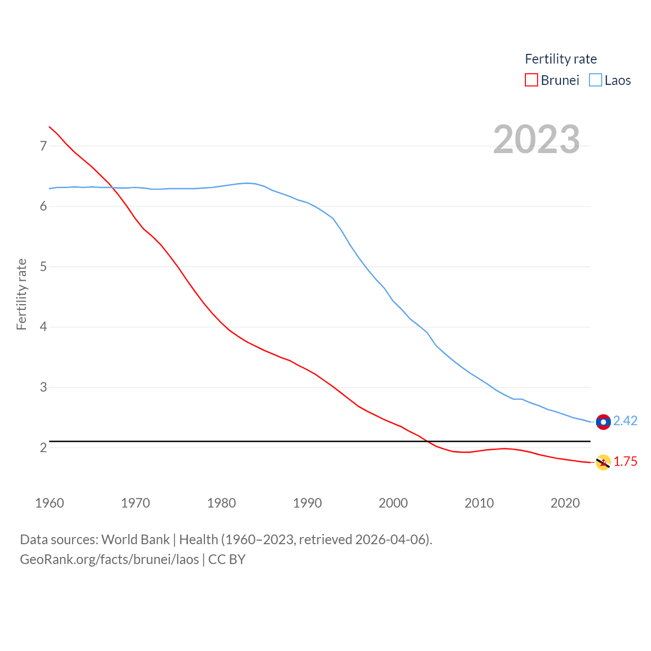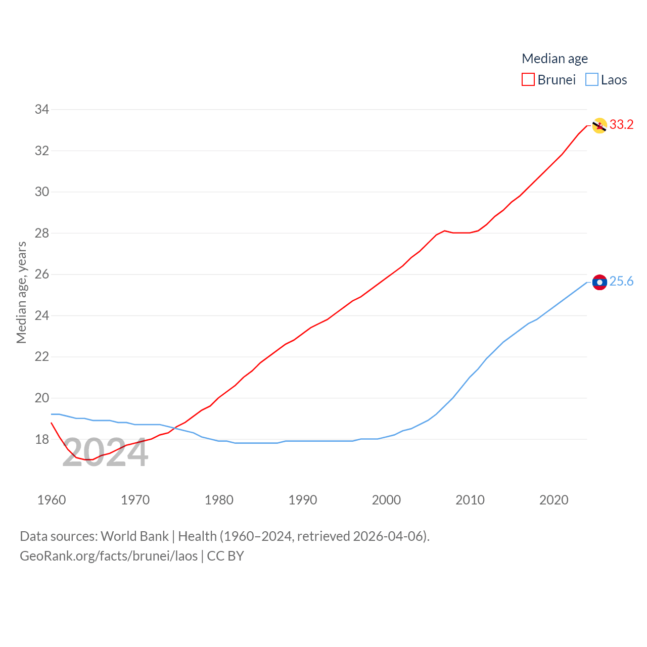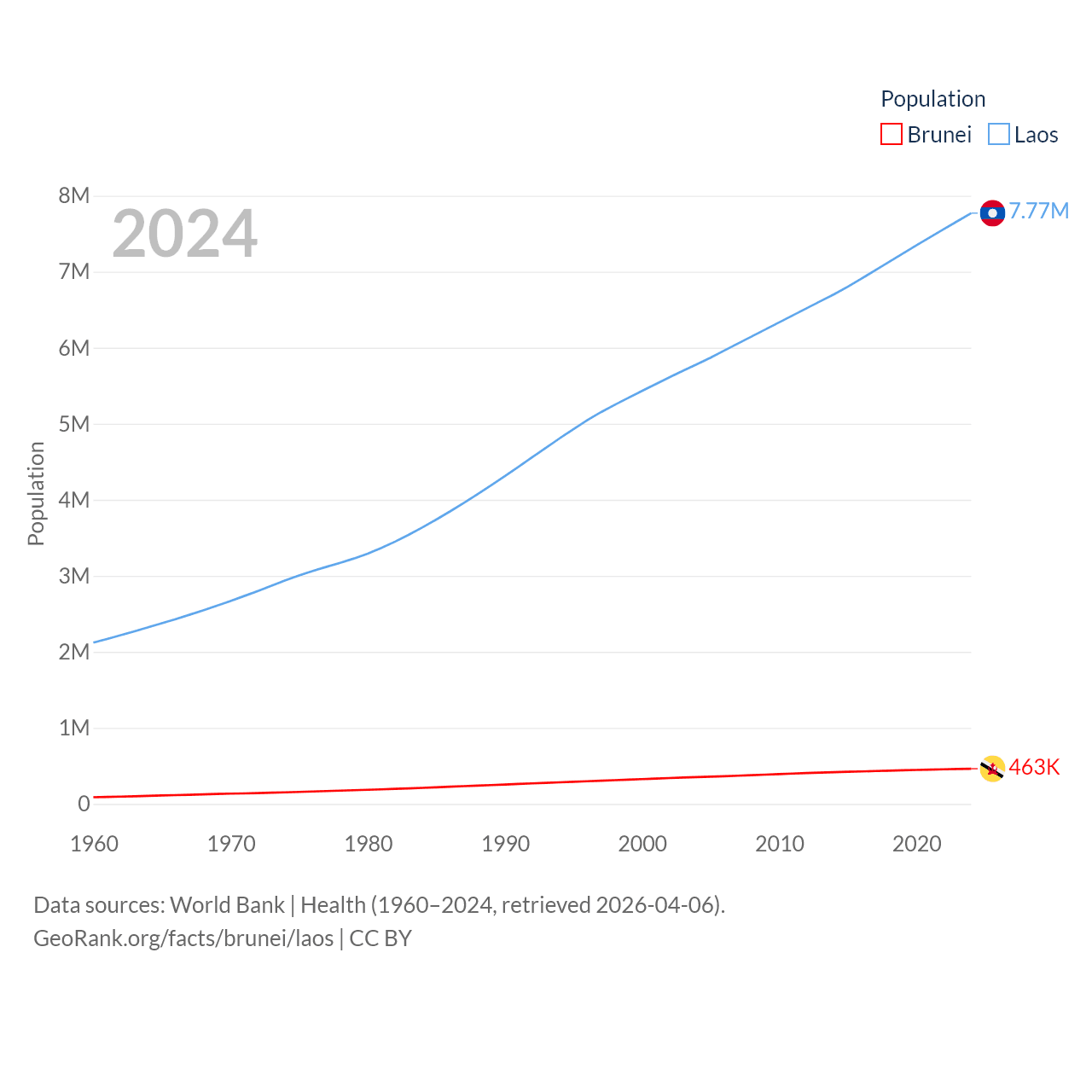 Brunei has a population of 463K (ranked 170/197), compared with 7.77M in Laos (ranked 103/197). Brunei's land area is 2,035 sq mi versus 89,112 sq mi for Laos (ranked 165th vs. 79th).