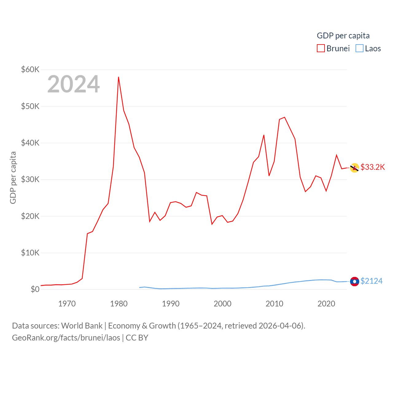 By GDP, Brunei ranks 142/197 ($15.3B) and Laos ranks 139/197 ($16.5B). By GDP per capita, Brunei ranks 36/197 ($33,153), while Laos ranks 155/197 ($2,124).