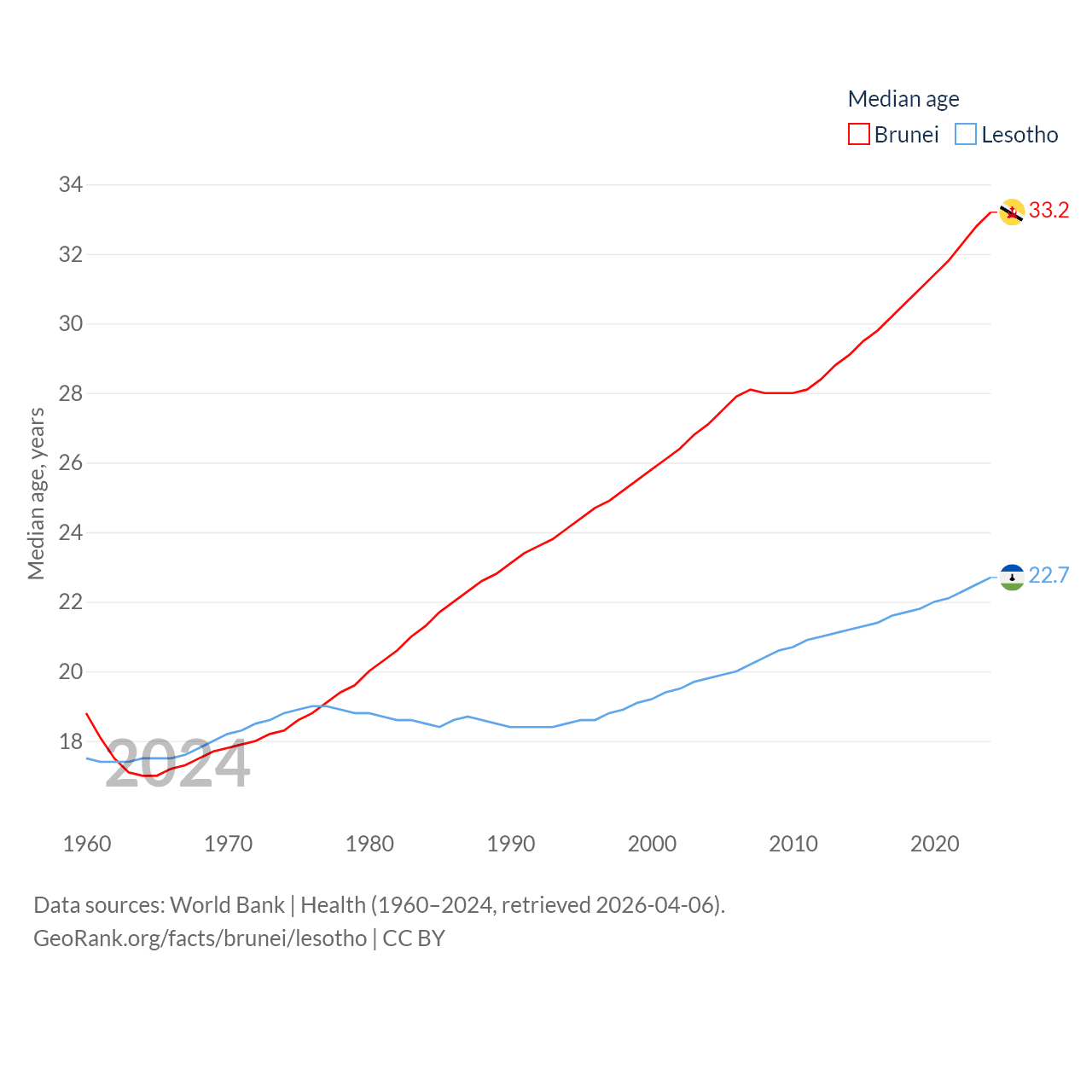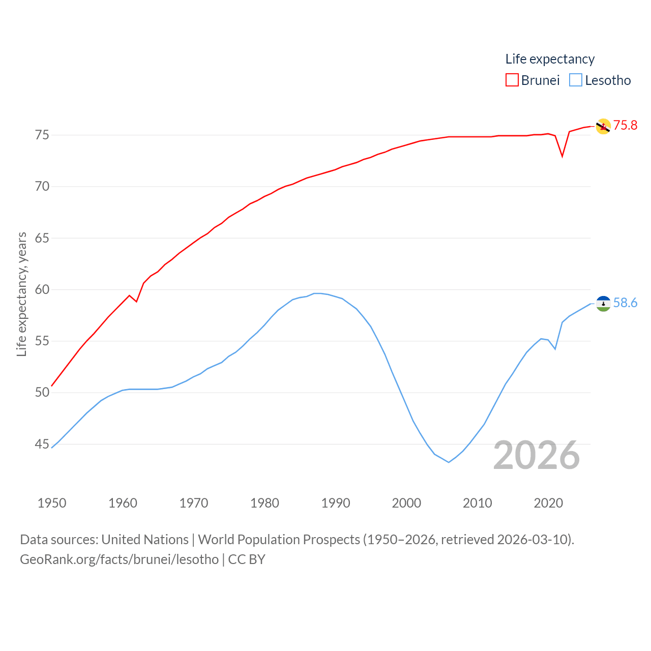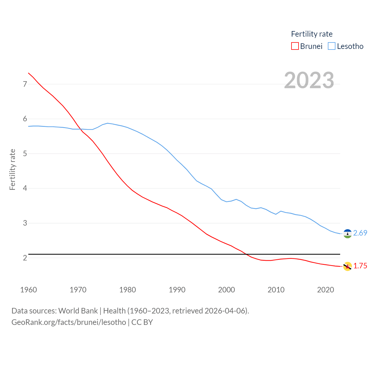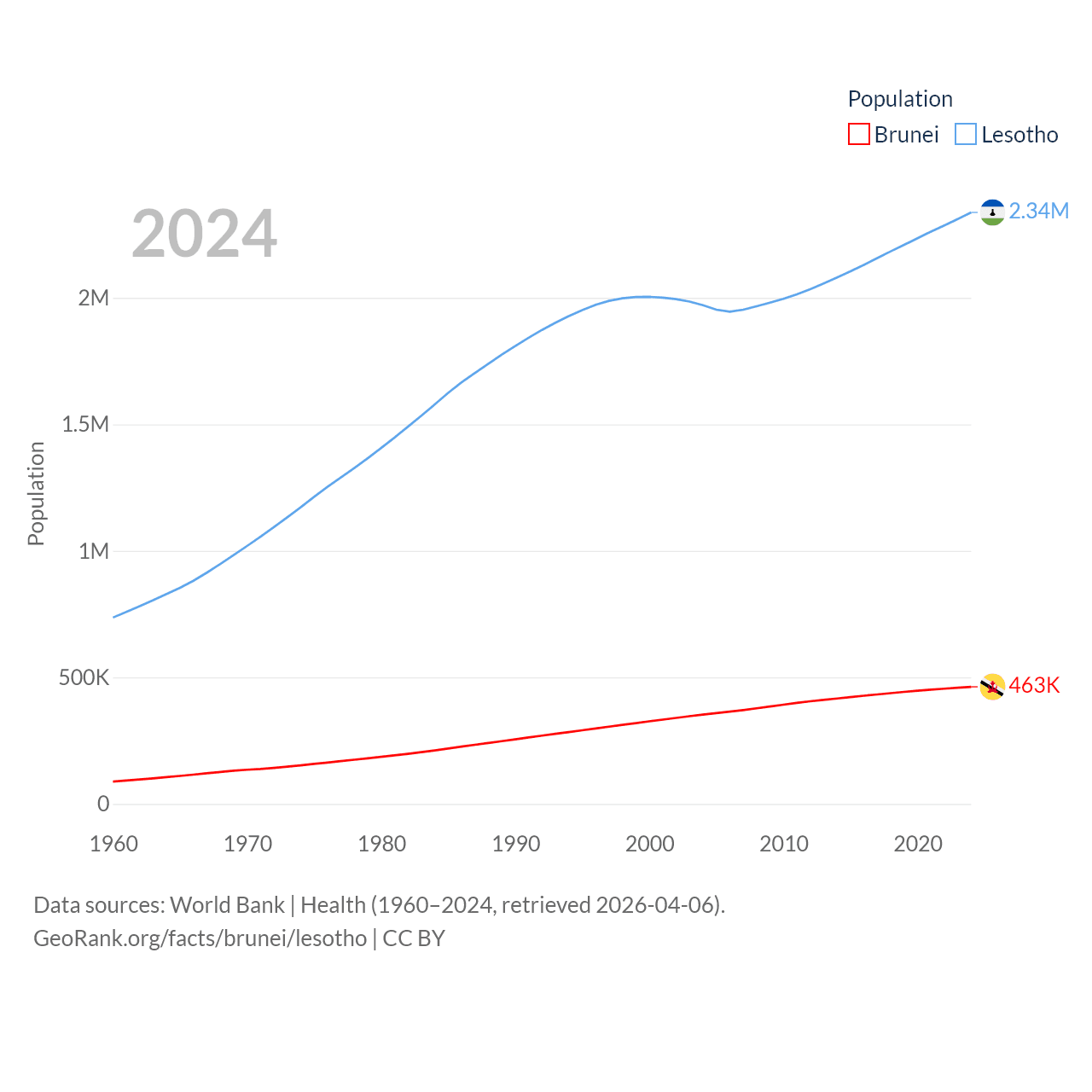 Brunei has a population of 463K (ranked 170/197), compared with 2.34M in Lesotho (ranked 145/197). Brunei's land area is 2,035 sq mi versus 11,722 sq mi for Lesotho (ranked 165th vs. 137th).