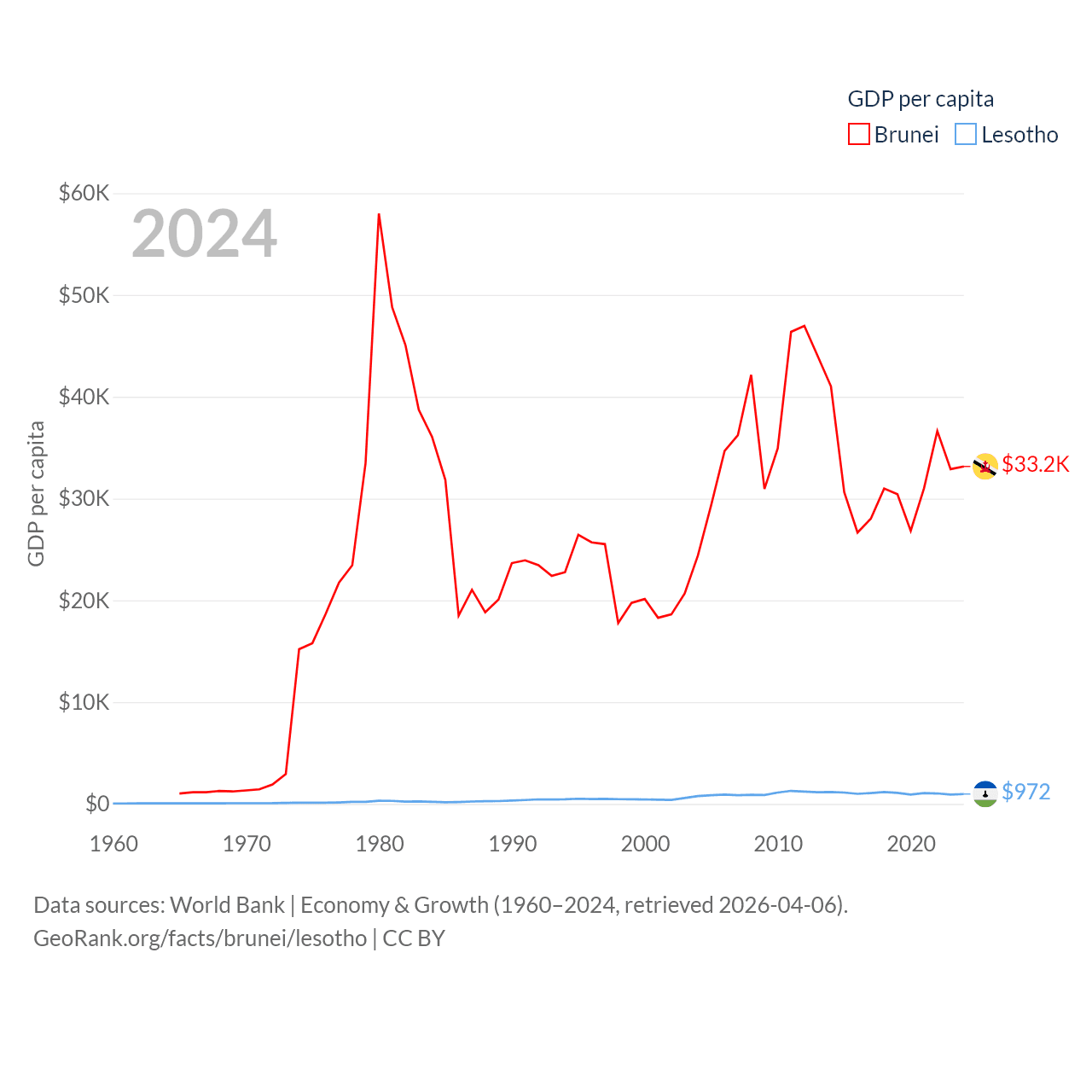 By GDP, Brunei ranks 142/197 ($15.3B) and Lesotho ranks 175/197 ($2.27B). By GDP per capita, Brunei ranks 36/197 ($33,153), while Lesotho ranks 181/197 ($972).