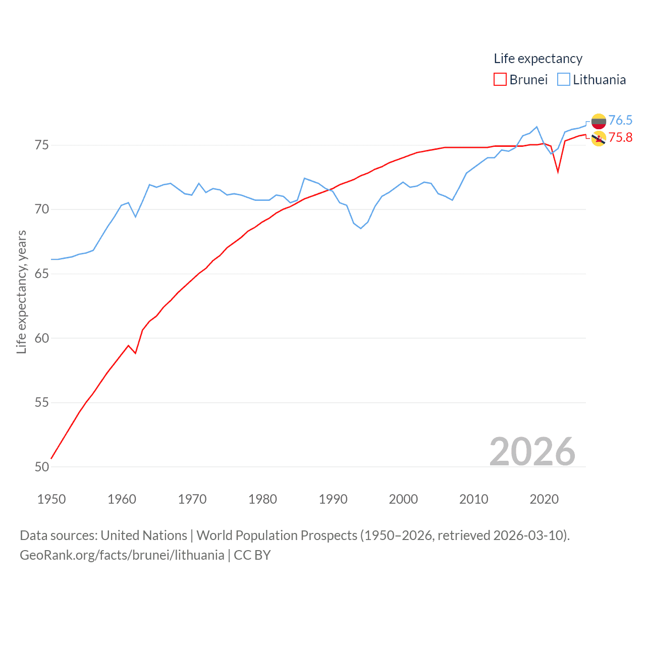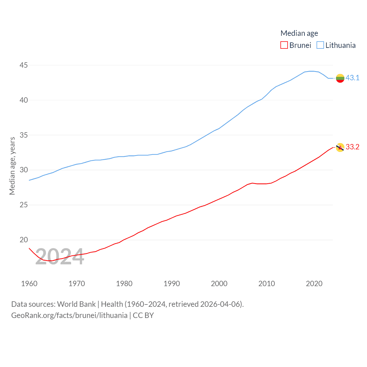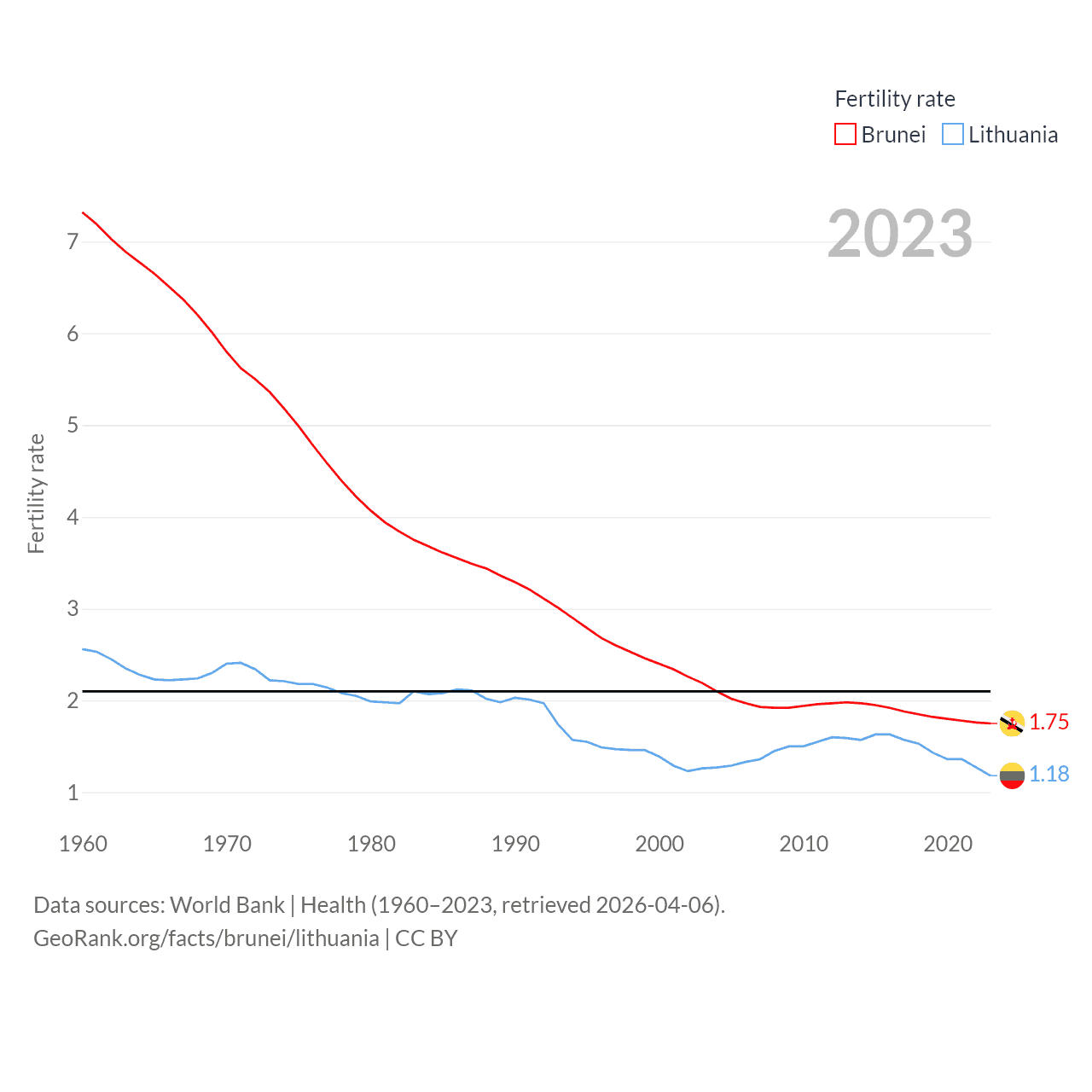 Brunei has a population of 463K (ranked 170/197), compared with 2.89M in Lithuania (ranked 137/197). Brunei's land area is 2,035 sq mi versus 24,170 sq mi for Lithuania (ranked 165th vs. 120th).