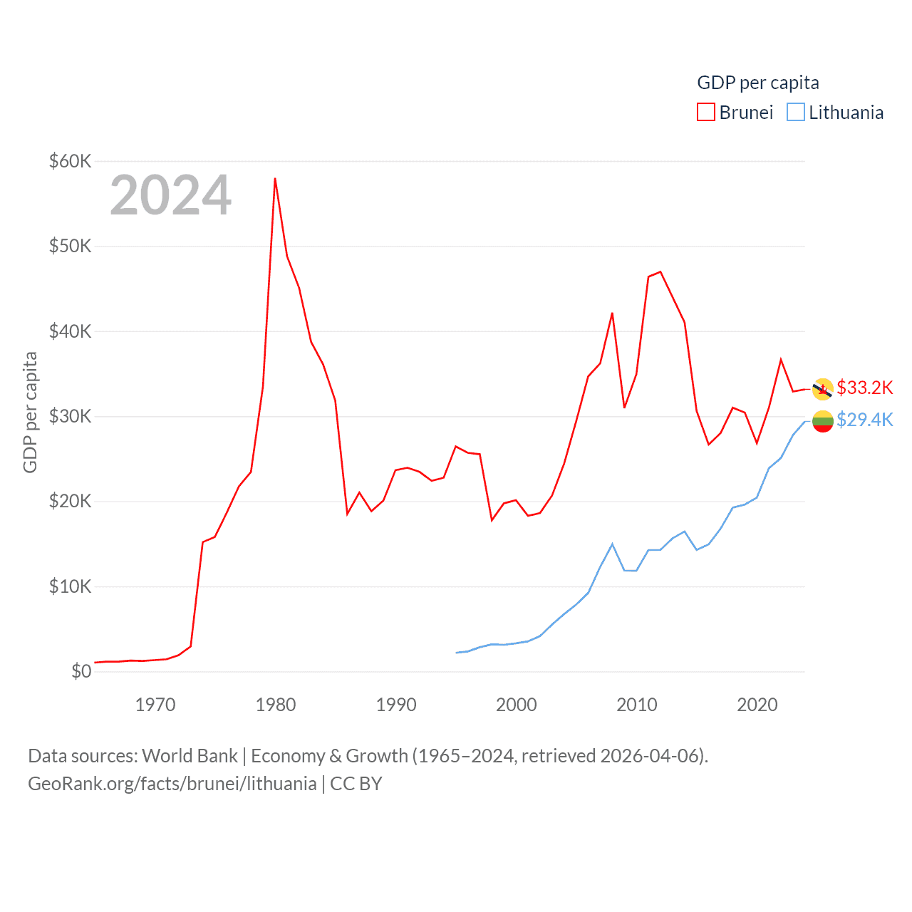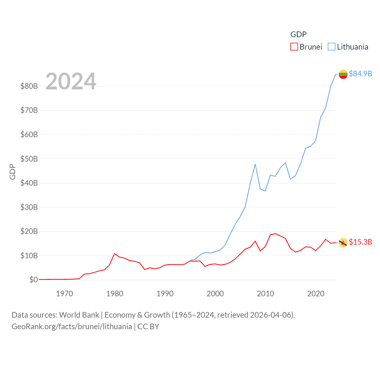 By GDP, Brunei ranks 142/197 ($15.3B) and Lithuania ranks 79/197 ($84.9B). By GDP per capita, Brunei ranks 36/197 ($33,153), while Lithuania ranks 43/197 ($29,384).
