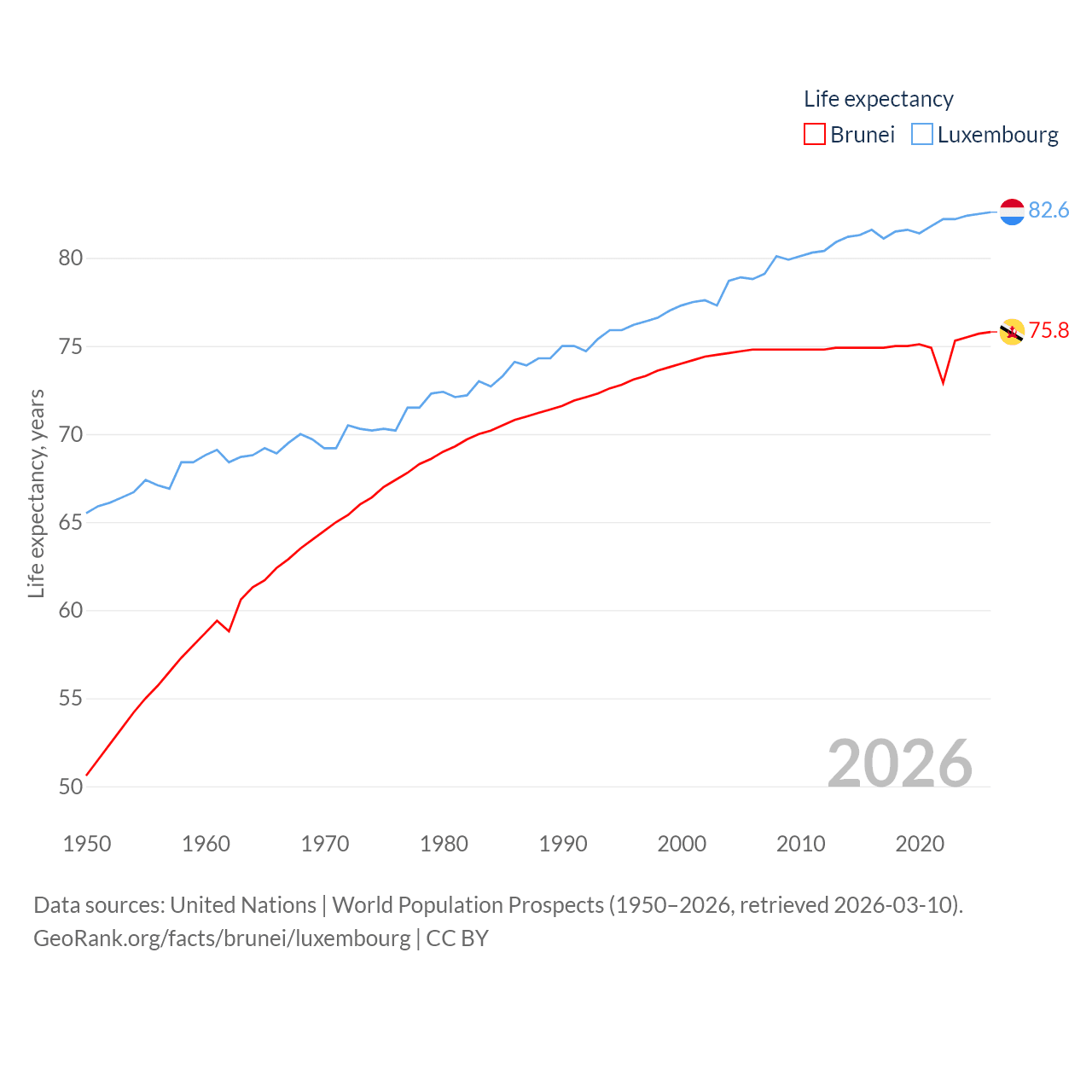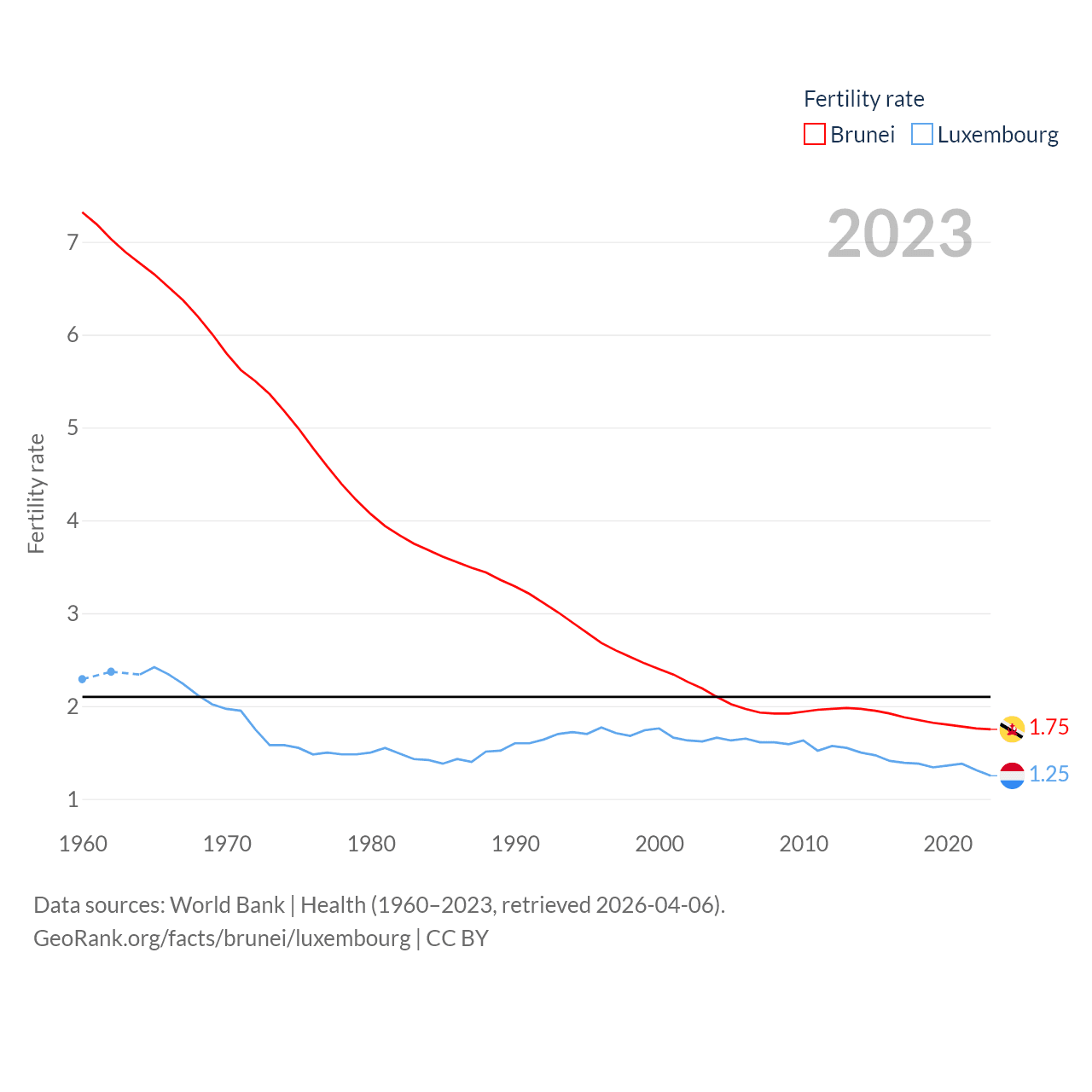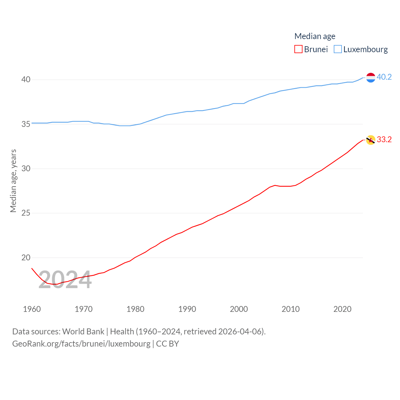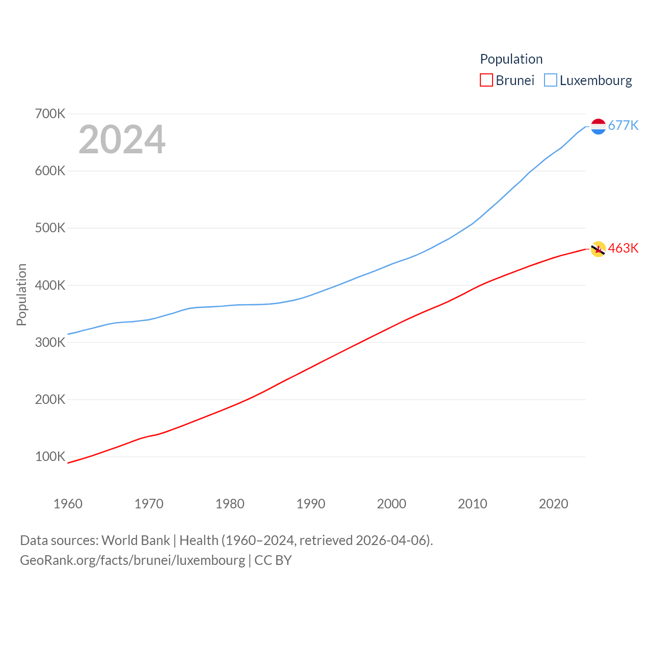 Brunei has a population of 463K (ranked 170/197), compared with 677K in Luxembourg (ranked 164/197). Brunei's land area is 2,035 sq mi versus 994 sq mi for Luxembourg (ranked 165th vs. 169th).