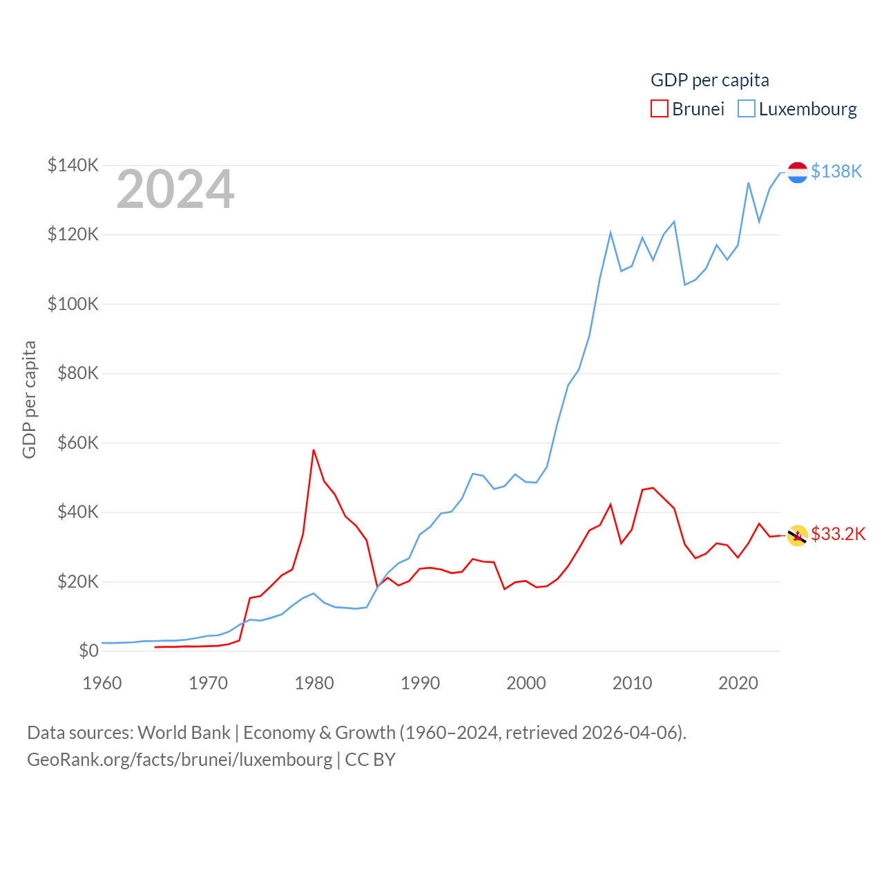 By GDP, Brunei ranks 142/197 ($15.3B) and Luxembourg ranks 74/197 ($93.3B). By GDP per capita, Brunei ranks 36/197 ($33,153), while Luxembourg ranks 3/197 ($137,782).