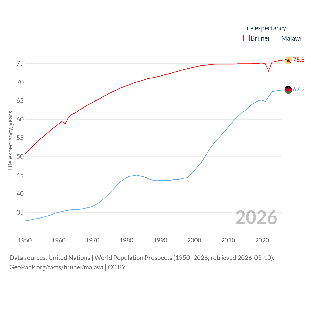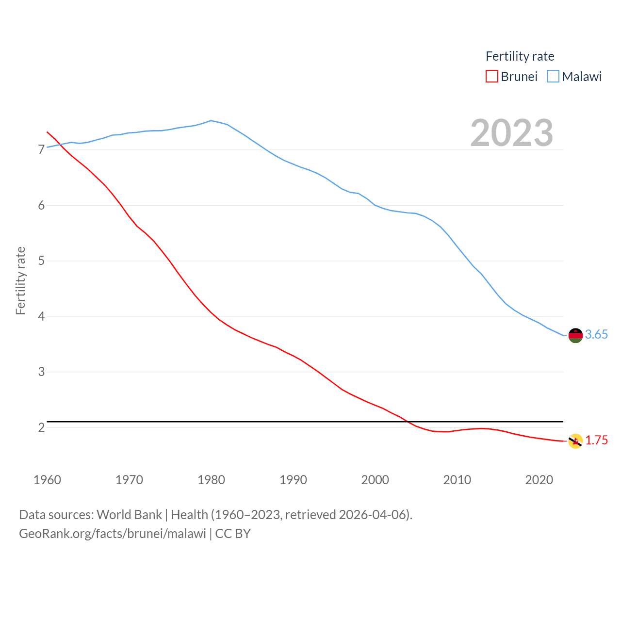Brunei has a population of 463K (ranked 170/197), compared with 21.7M in Malawi (ranked 62/197). Brunei's land area is 2,035 sq mi versus 36,402 sq mi for Malawi (ranked 165th vs. 107th).