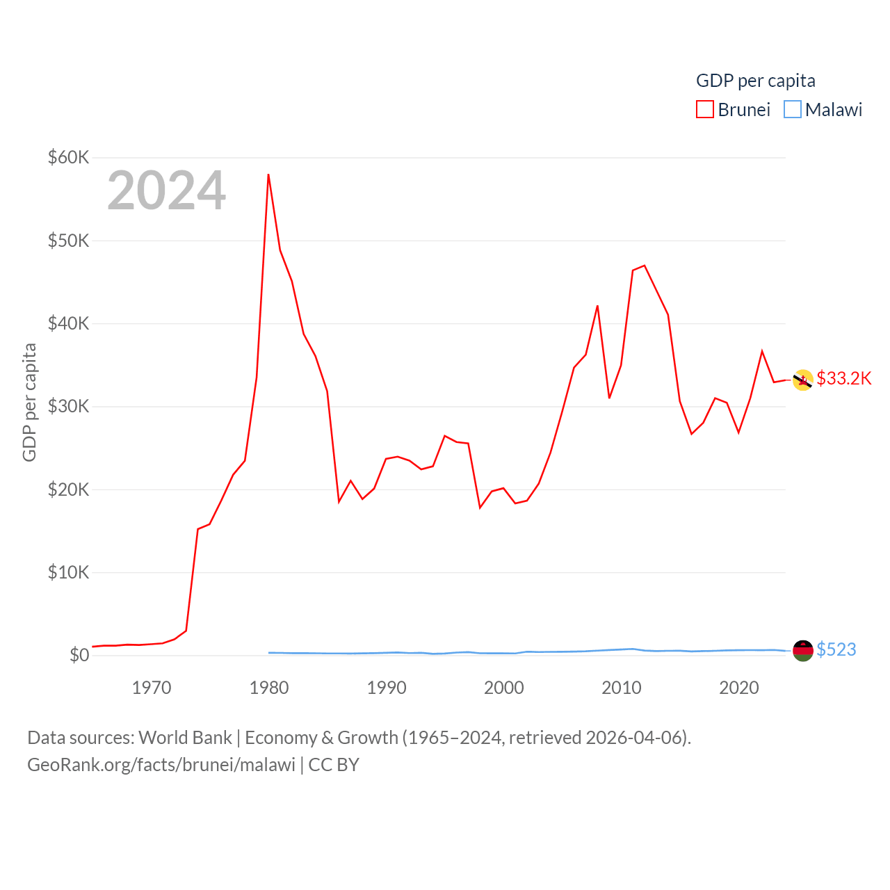 By GDP, Brunei ranks 142/197 ($15.3B) and Malawi ranks 151/197 ($11.3B). By GDP per capita, Brunei ranks 36/197 ($33,153), while Malawi ranks 194/197 ($523).