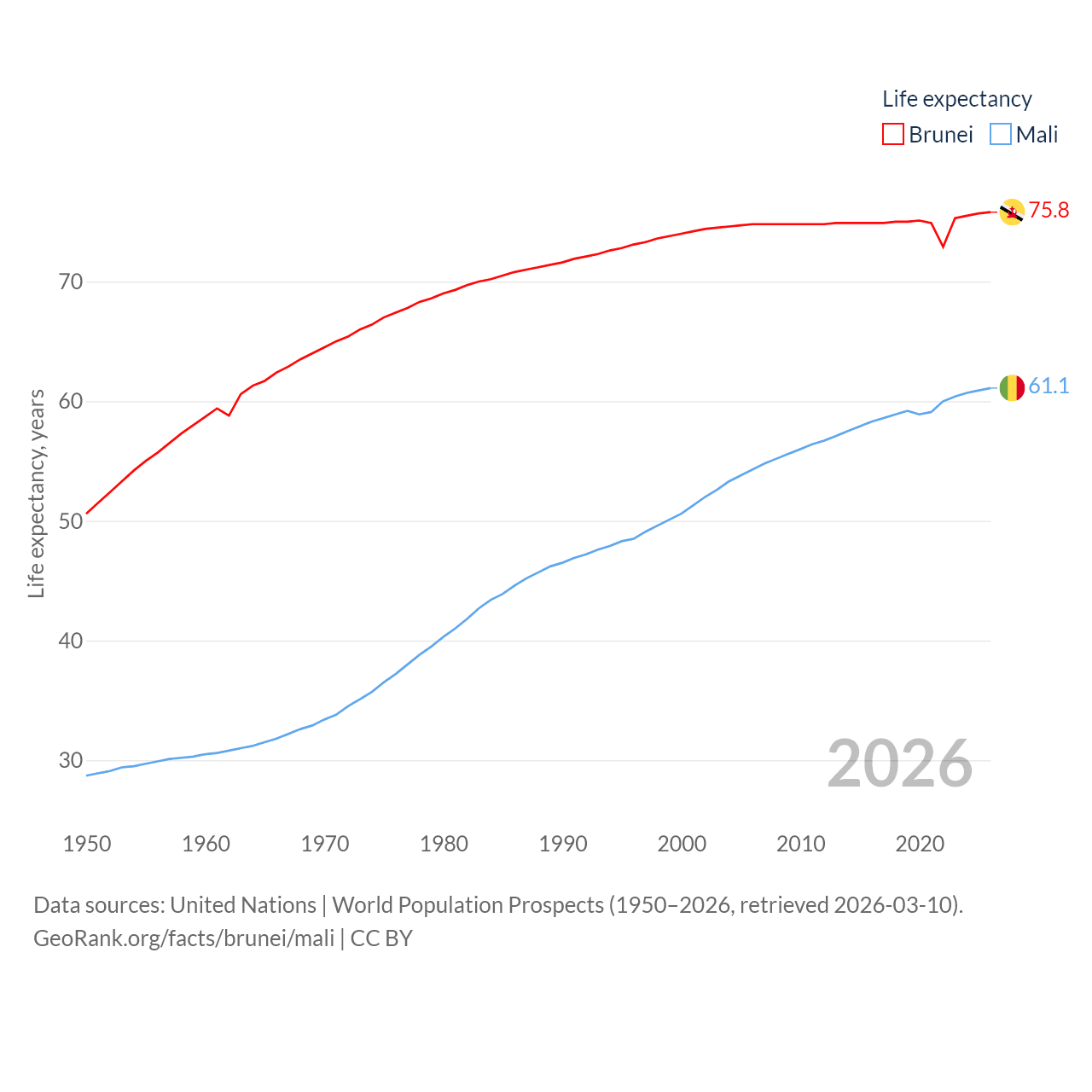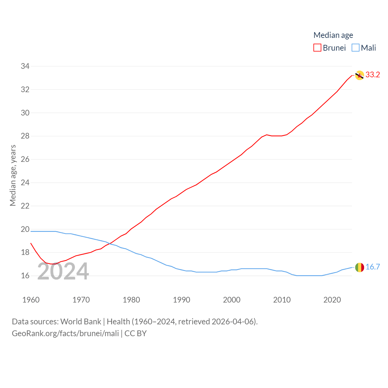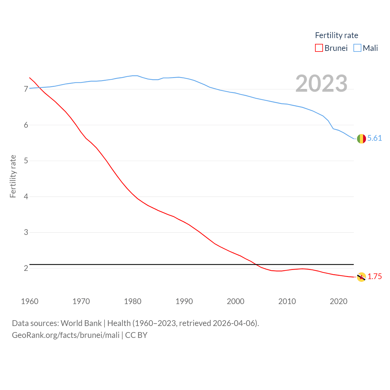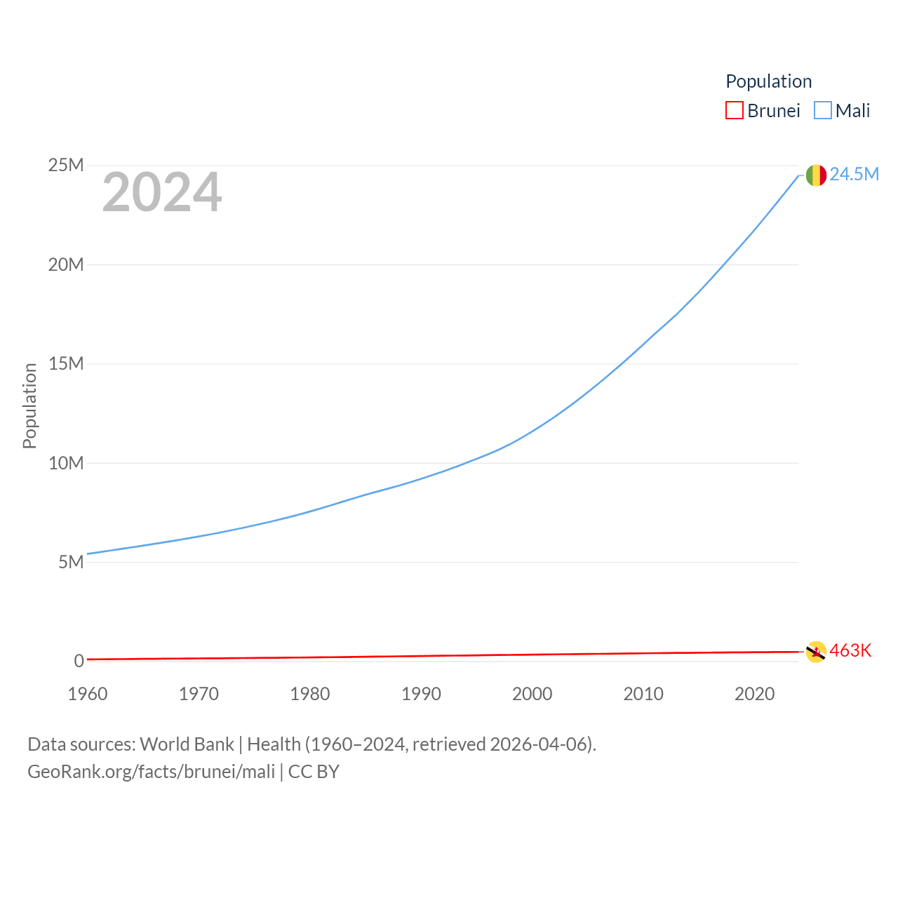 Brunei has a population of 463K (ranked 170/197), compared with 24.5M in Mali (ranked 58/197). Brunei's land area is 2,035 sq mi versus 471,118 sq mi for Mali (ranked 165th vs. 23rd).