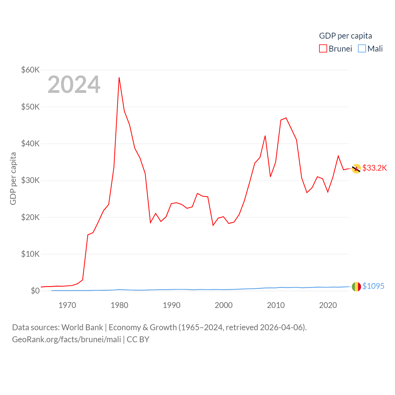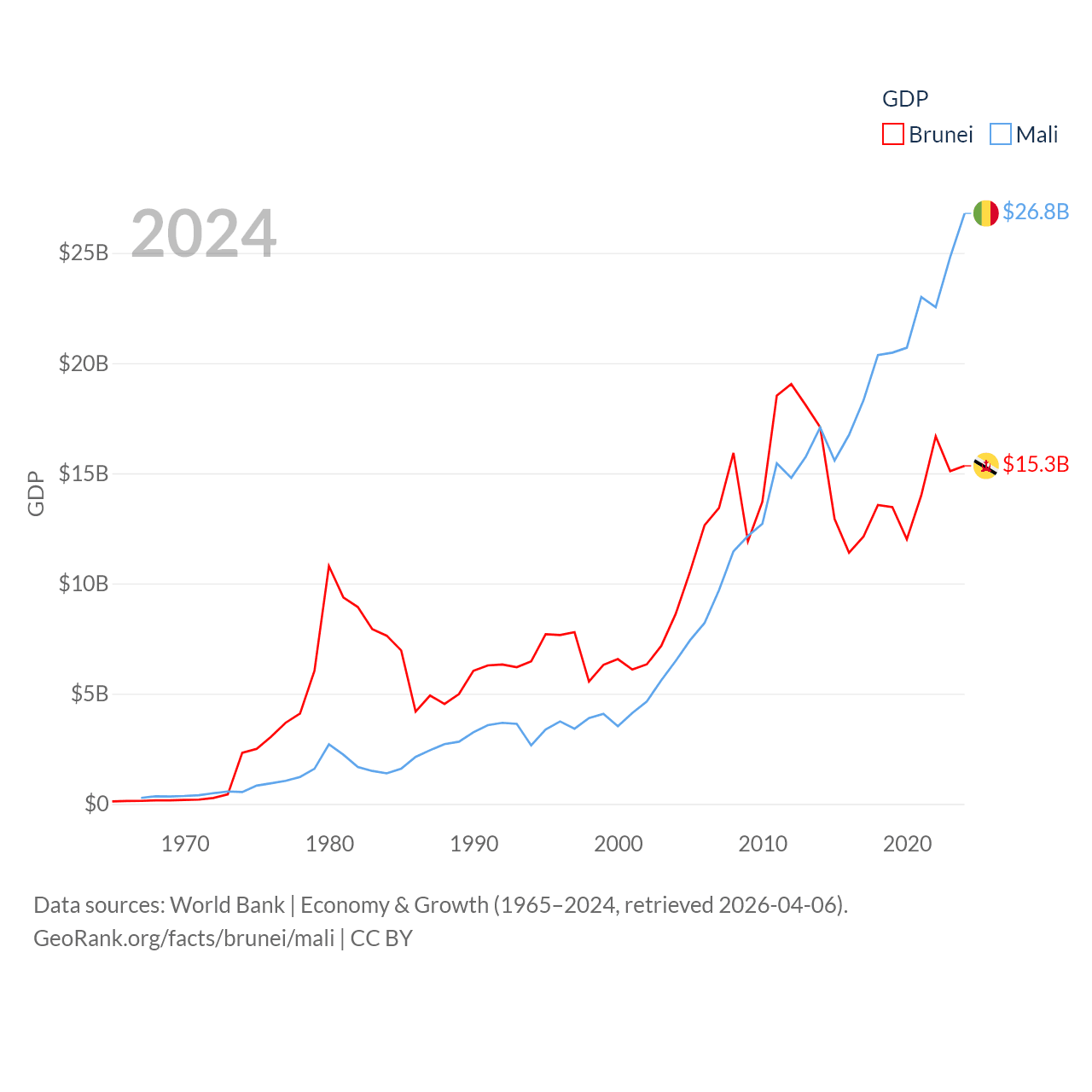 By GDP, Brunei ranks 142/197 ($15.3B) and Mali ranks 113/197 ($26.8B). By GDP per capita, Brunei ranks 36/197 ($33,153), while Mali ranks 173/197 ($1,095).