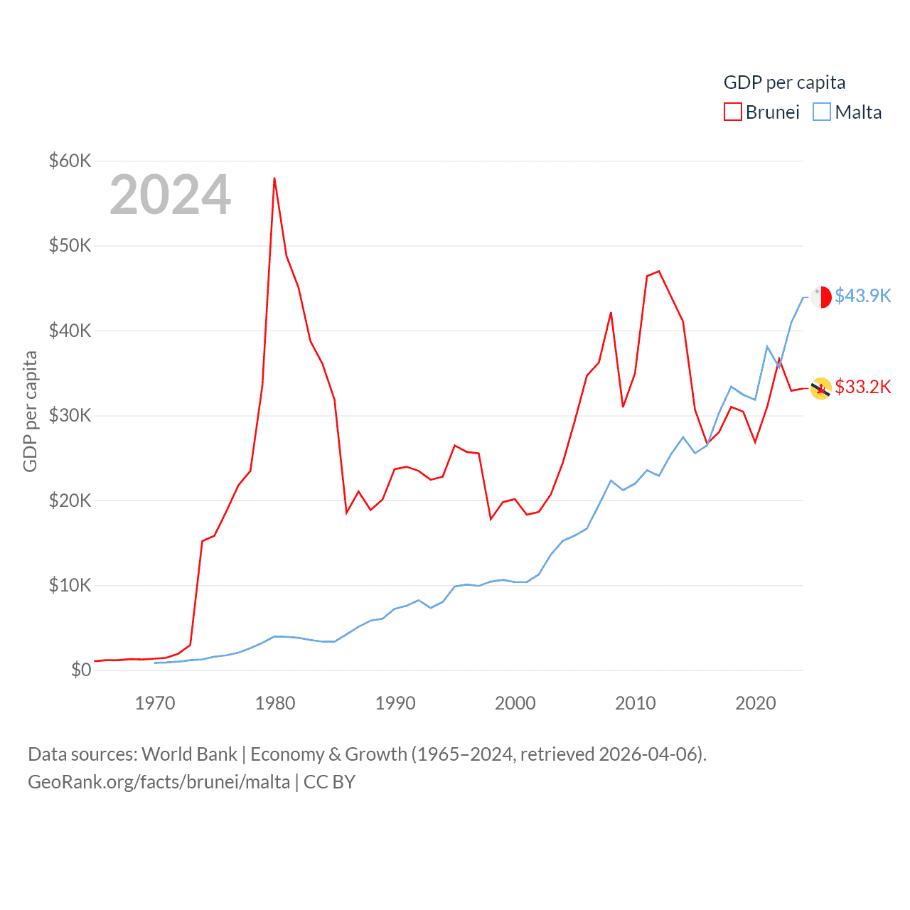 By GDP, Brunei ranks 142/197 ($15.3B) and Malta ranks 119/197 ($25B). By GDP per capita, Brunei ranks 36/197 ($33,153), while Malta ranks 28/197 ($43,899).