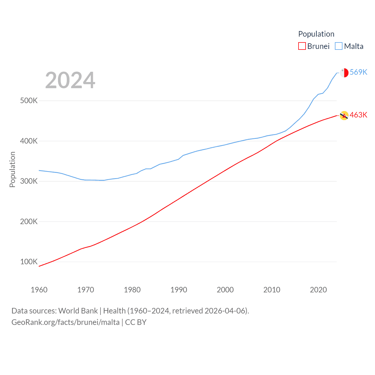 Brunei has a population of 463K (ranked 170/197), compared with 569K in Malta (ranked 167/197). Brunei's land area is 2,035 sq mi versus 123.6 sq mi for Malta (ranked 165th vs. 187th).
