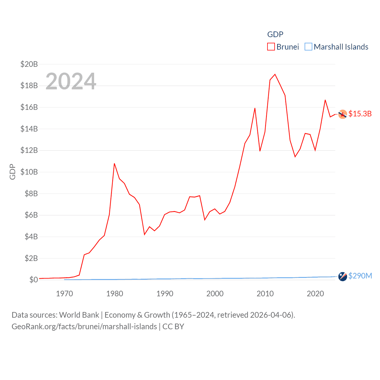 By GDP, Brunei ranks 142/197 ($15.3B) and The Marshall Islands ranks 193/197 ($290M). By GDP per capita, Brunei ranks 36/197 ($33,153), while The Marshall Islands ranks 96/197 ($7,726).