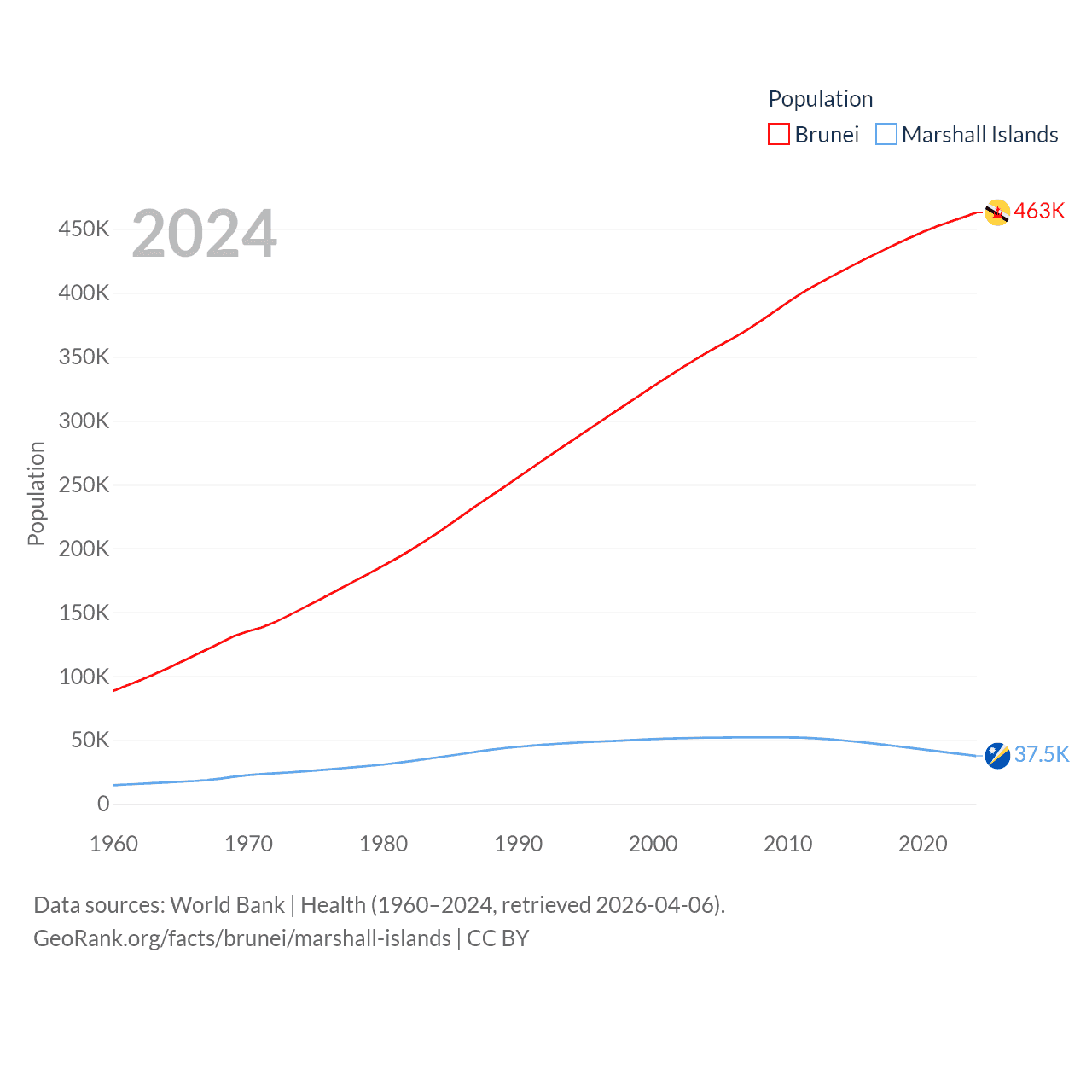 Brunei has a population of 463K (ranked 170/197), compared with 37.5K in The Marshall Islands (ranked 192/197). Brunei's land area is 2,035 sq mi versus 69.5 sq mi for The Marshall Islands (ranked 165th vs. 191st).