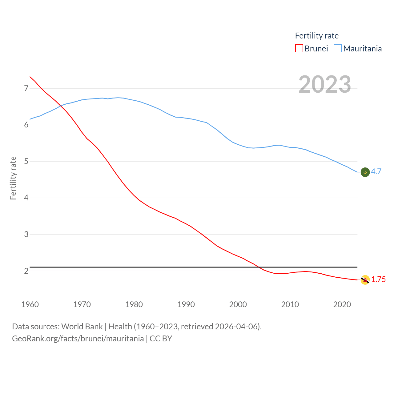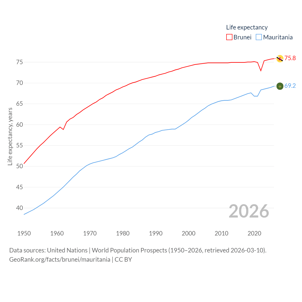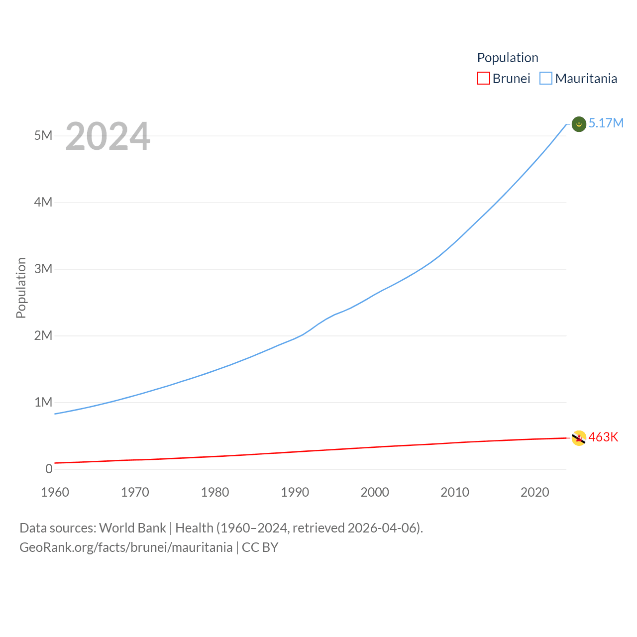 Brunei has a population of 463K (ranked 170/197), compared with 5.17M in Mauritania (ranked 125/197). Brunei's land area is 2,035 sq mi versus 397,955 sq mi for Mauritania (ranked 165th vs. 28th).