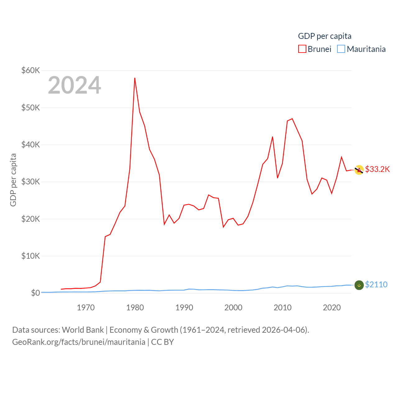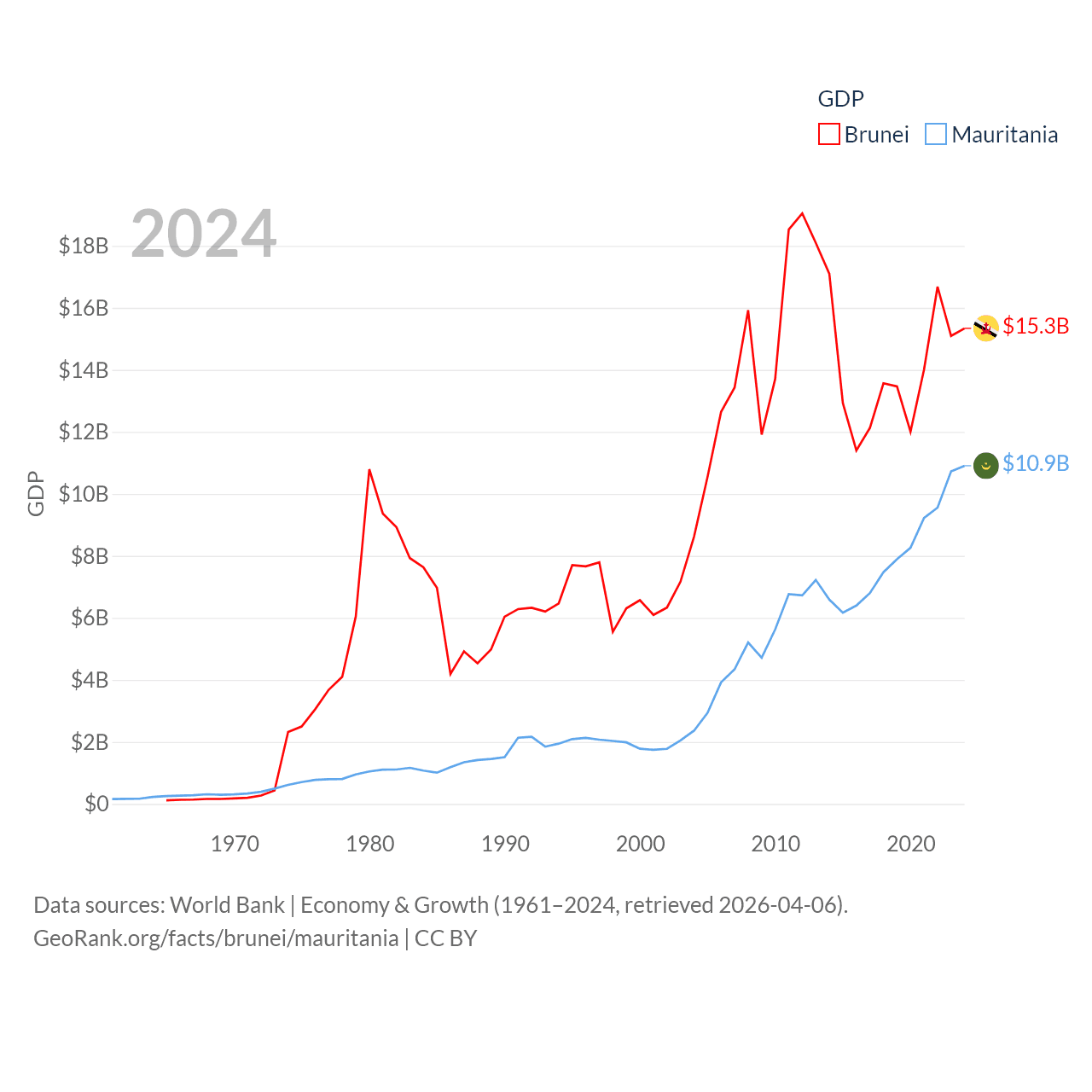 By GDP, Brunei ranks 142/197 ($15.3B) and Mauritania ranks 153/197 ($10.9B). By GDP per capita, Brunei ranks 36/197 ($33,153), while Mauritania ranks 156/197 ($2,110).