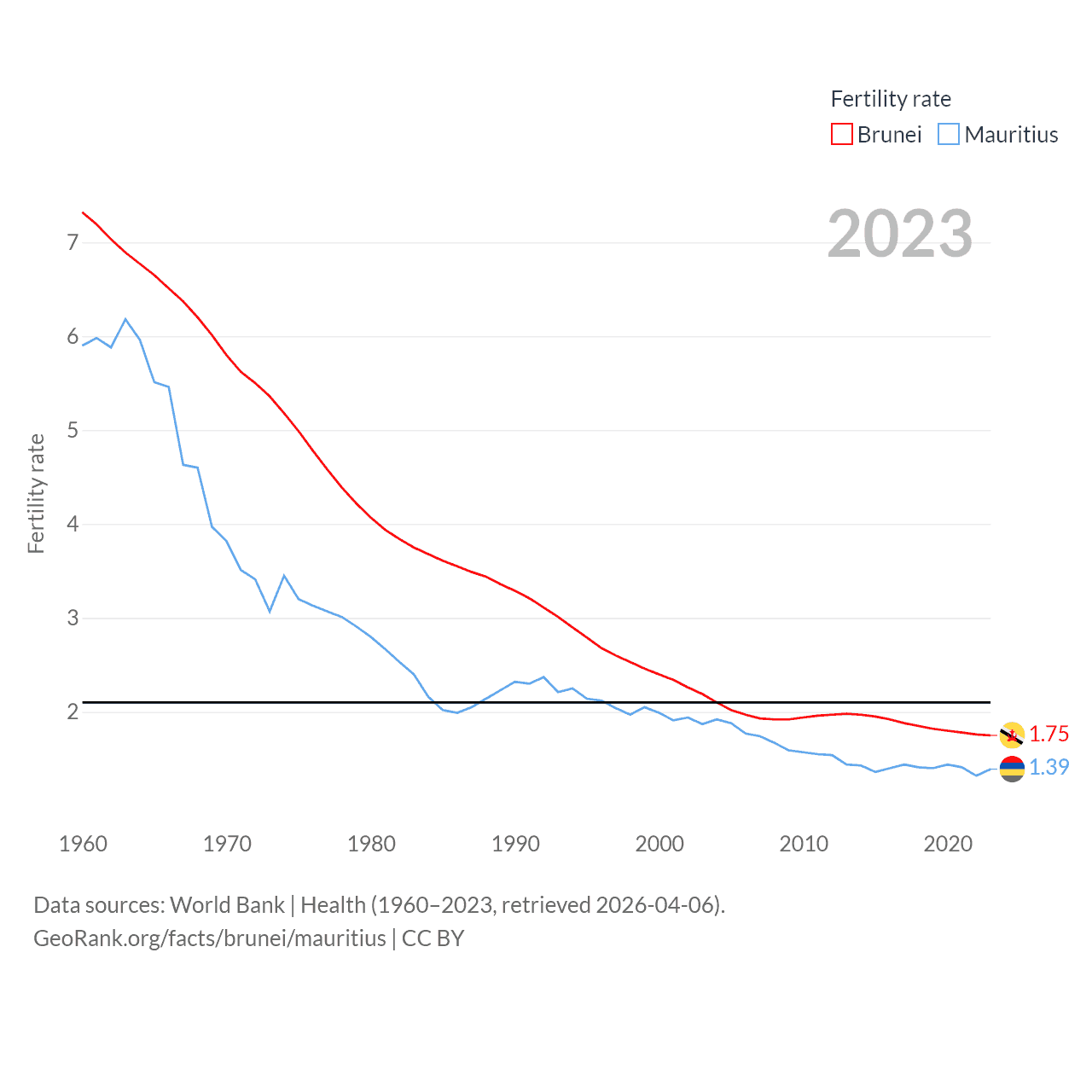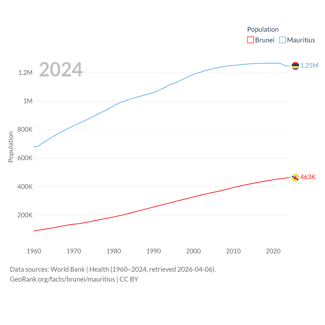 Brunei has a population of 463K (ranked 170/197), compared with 1.25M in Mauritius (ranked 156/197). Brunei's land area is 2,035 sq mi versus 771 sq mi for Mauritius (ranked 165th vs. 170th).
