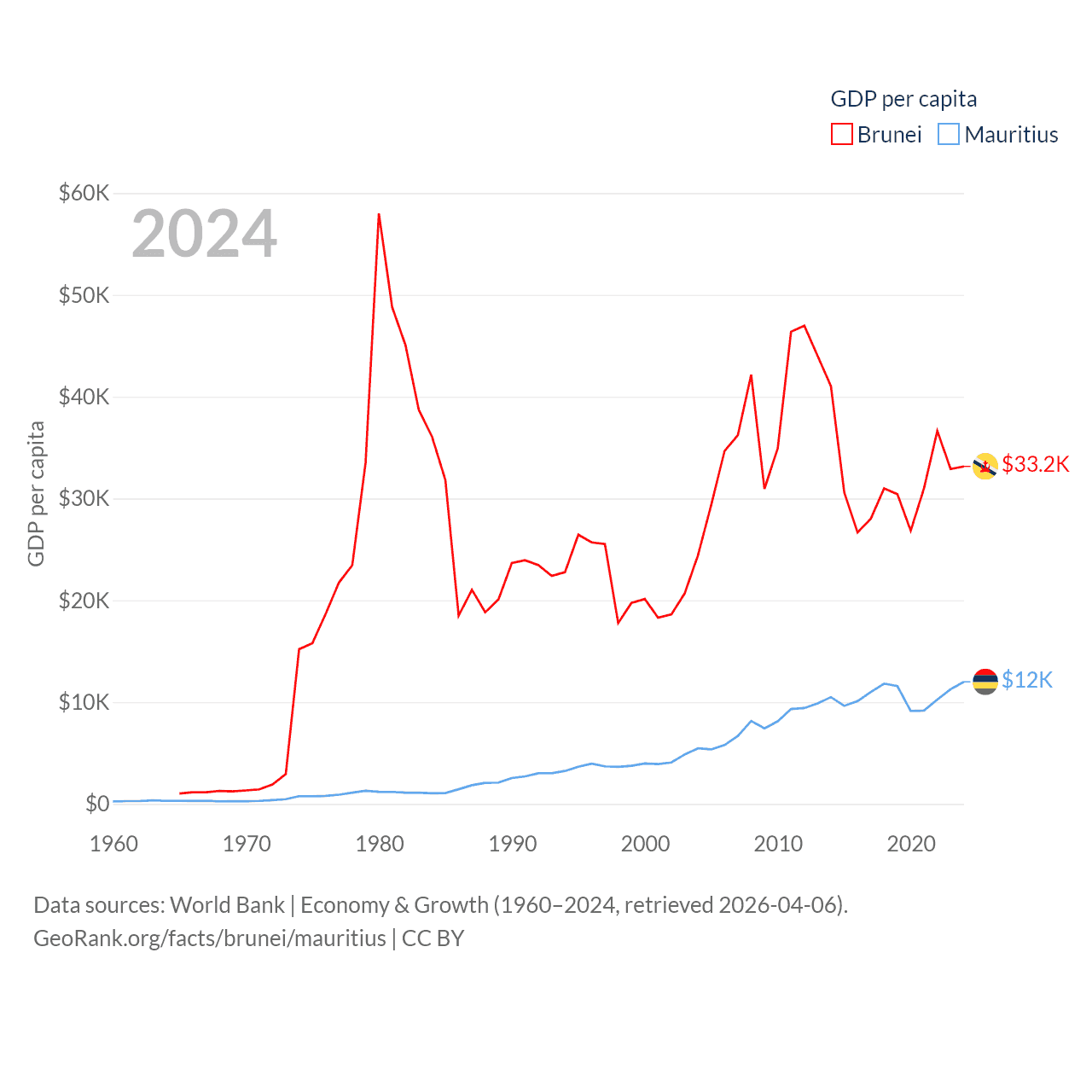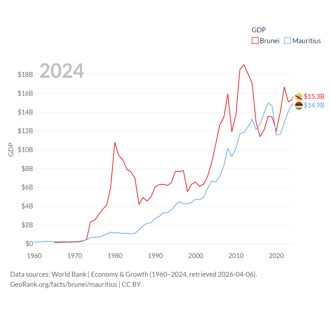By GDP, Brunei ranks 142/197 ($15.3B) and Mauritius ranks 143/197 ($14.9B). By GDP per capita, Brunei ranks 36/197 ($33,153), while Mauritius ranks 78/197 ($11,991).