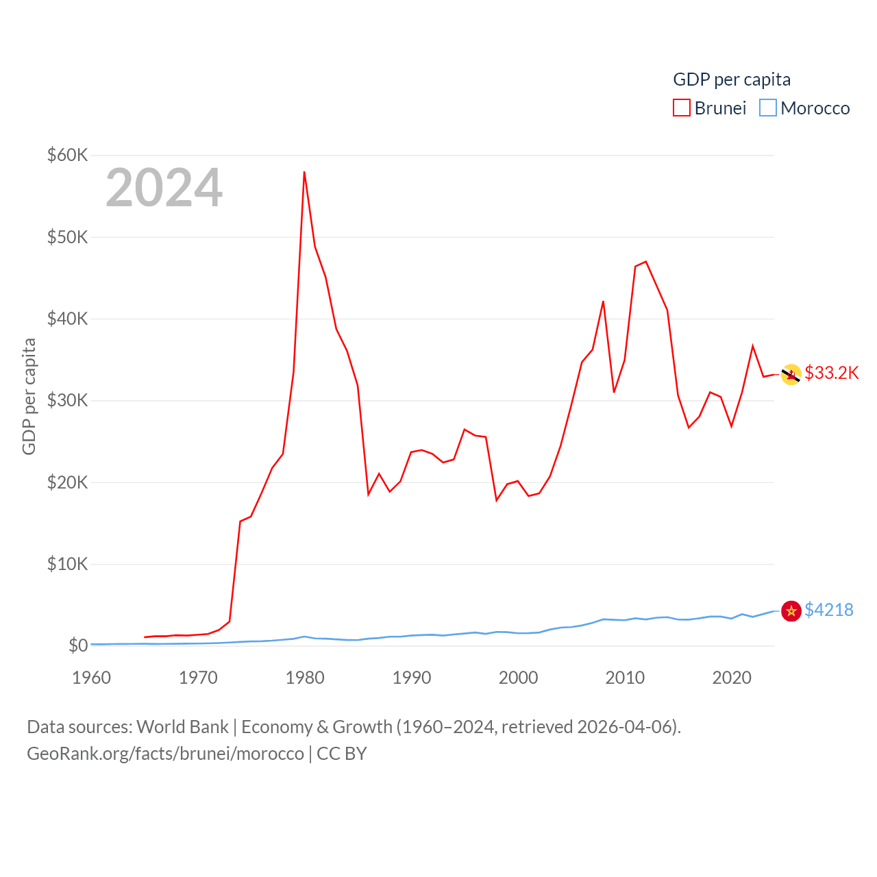 By GDP, Brunei ranks 142/197 ($15.3B) and Morocco ranks 58/197 ($161B). By GDP per capita, Brunei ranks 36/197 ($33,153), while Morocco ranks 127/197 ($4,218).