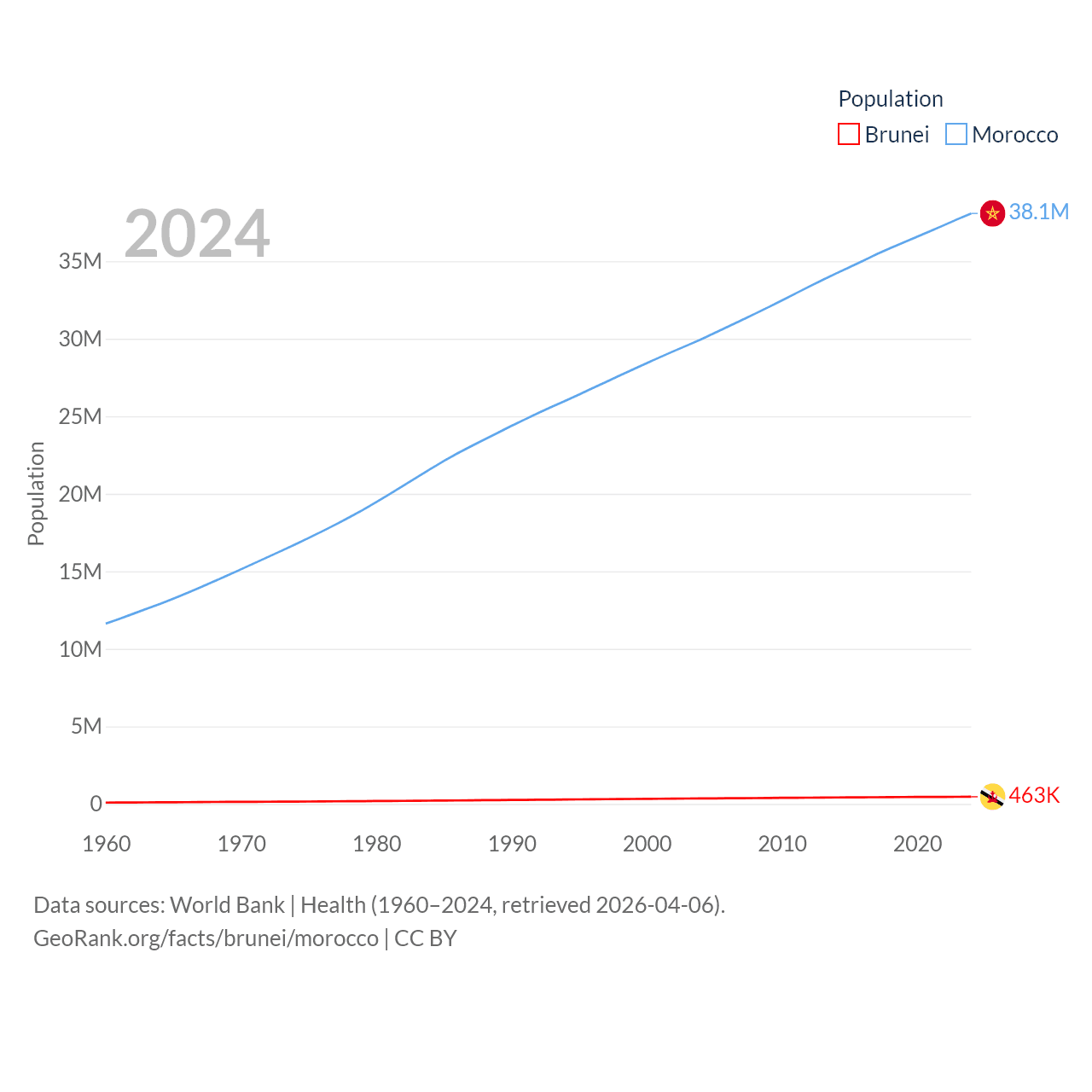 Brunei has a population of 463K (ranked 170/197), compared with 38.1M in Morocco (ranked 39/197). Brunei's land area is 2,035 sq mi versus 172,317 sq mi for Morocco (ranked 165th vs. 55th).