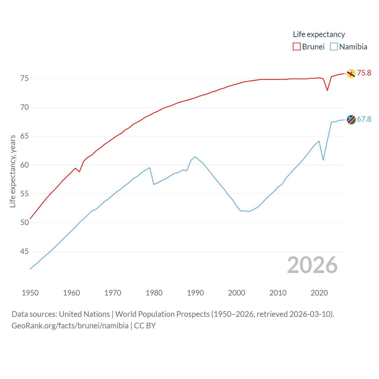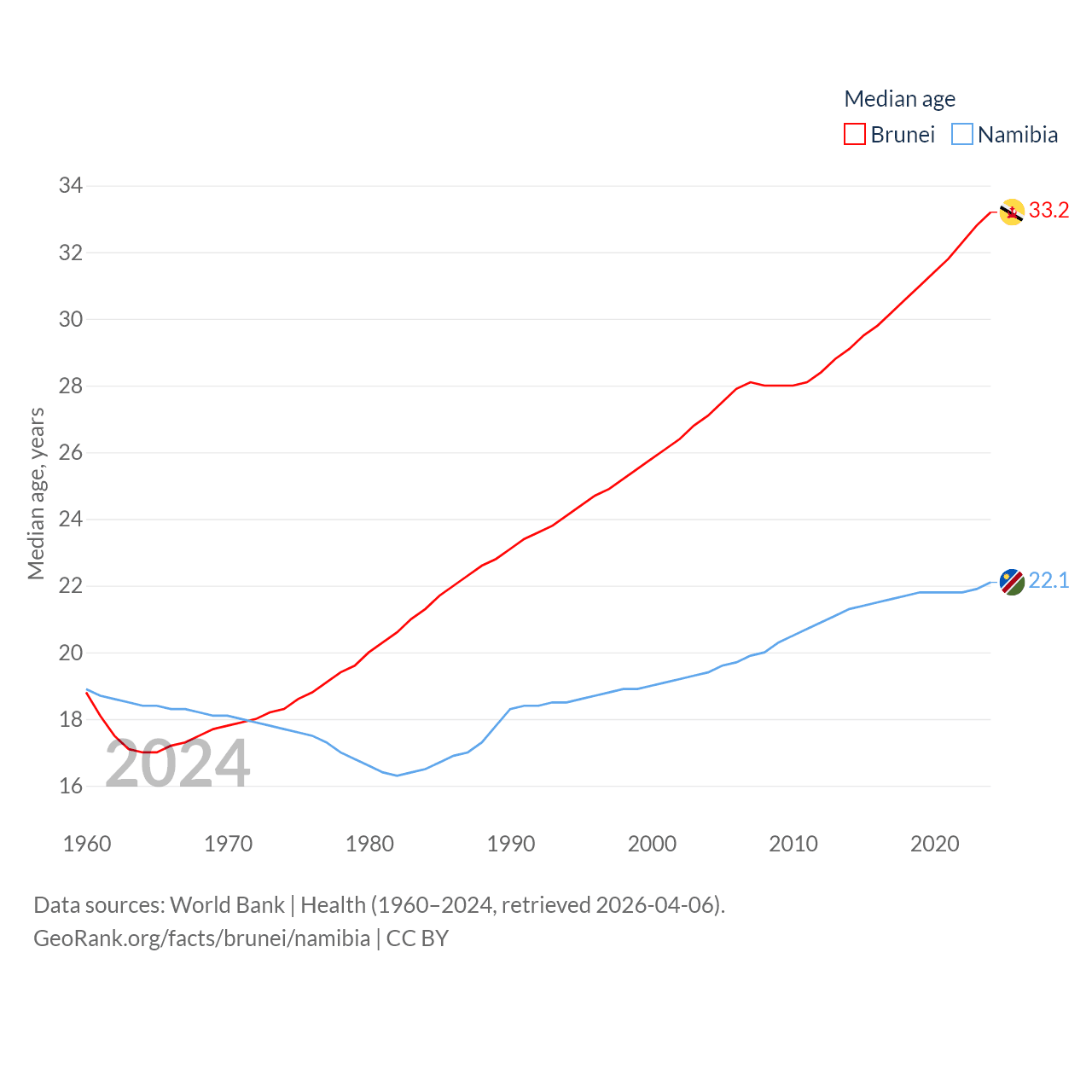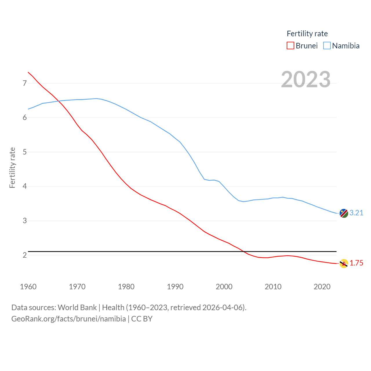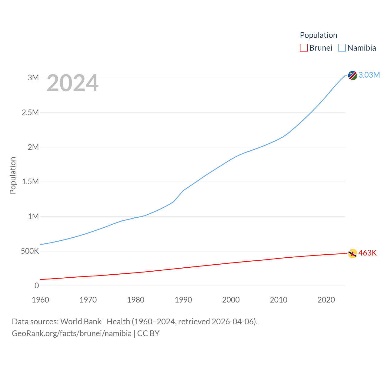 Brunei has a population of 463K (ranked 170/197), compared with 3.03M in Namibia (ranked 136/197). Brunei's land area is 2,035 sq mi versus 317,874 sq mi for Namibia (ranked 165th vs. 33rd).