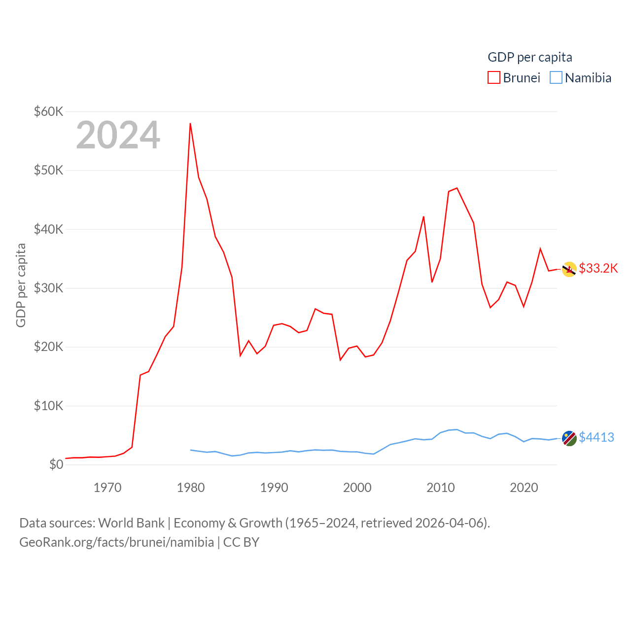 By GDP, Brunei ranks 142/197 ($15.3B) and Namibia ranks 147/197 ($13.4B). By GDP per capita, Brunei ranks 36/197 ($33,153), while Namibia ranks 126/197 ($4,413).