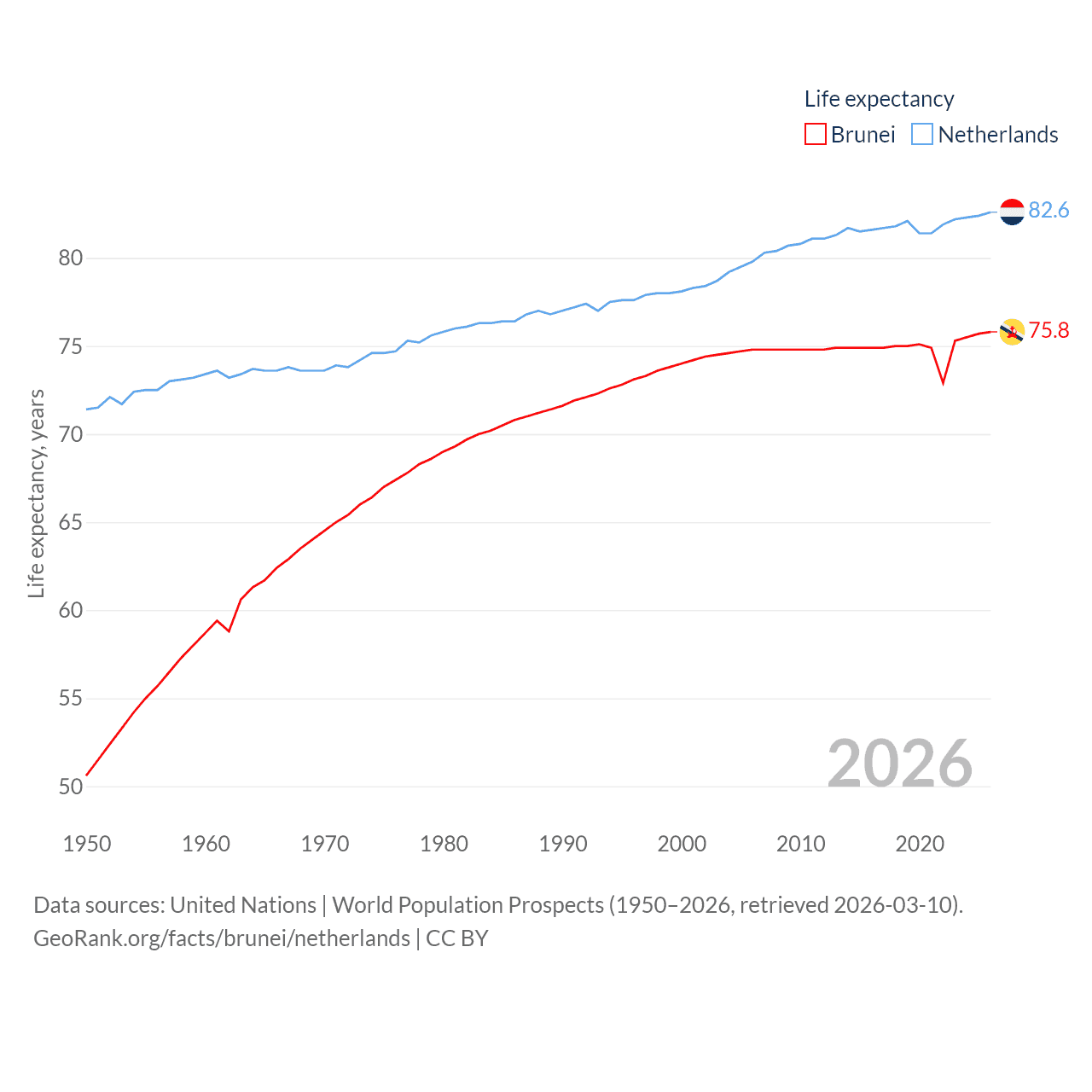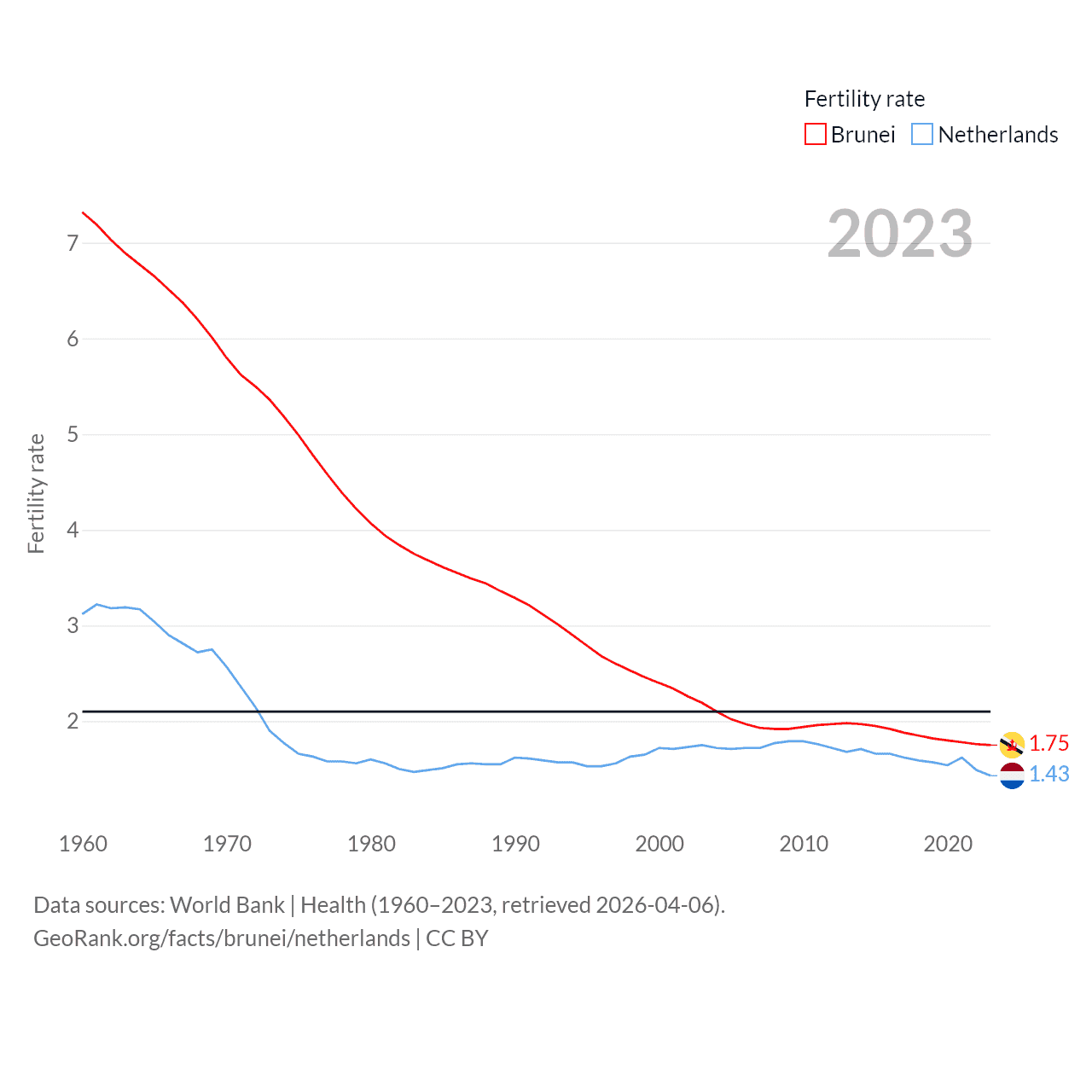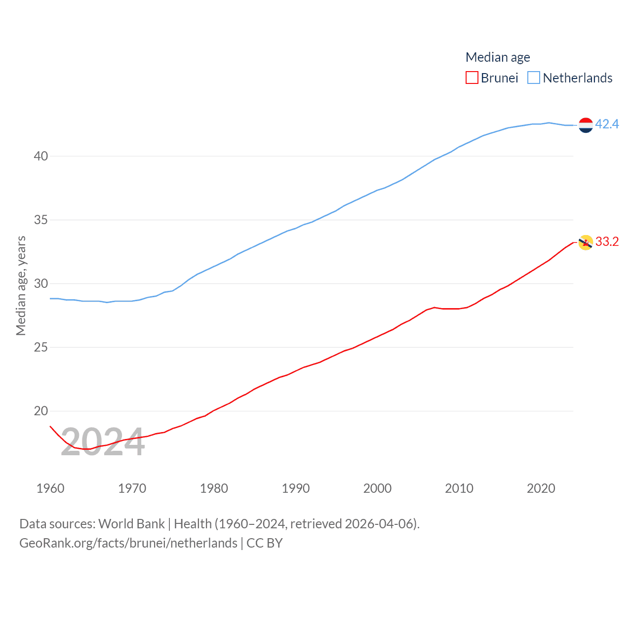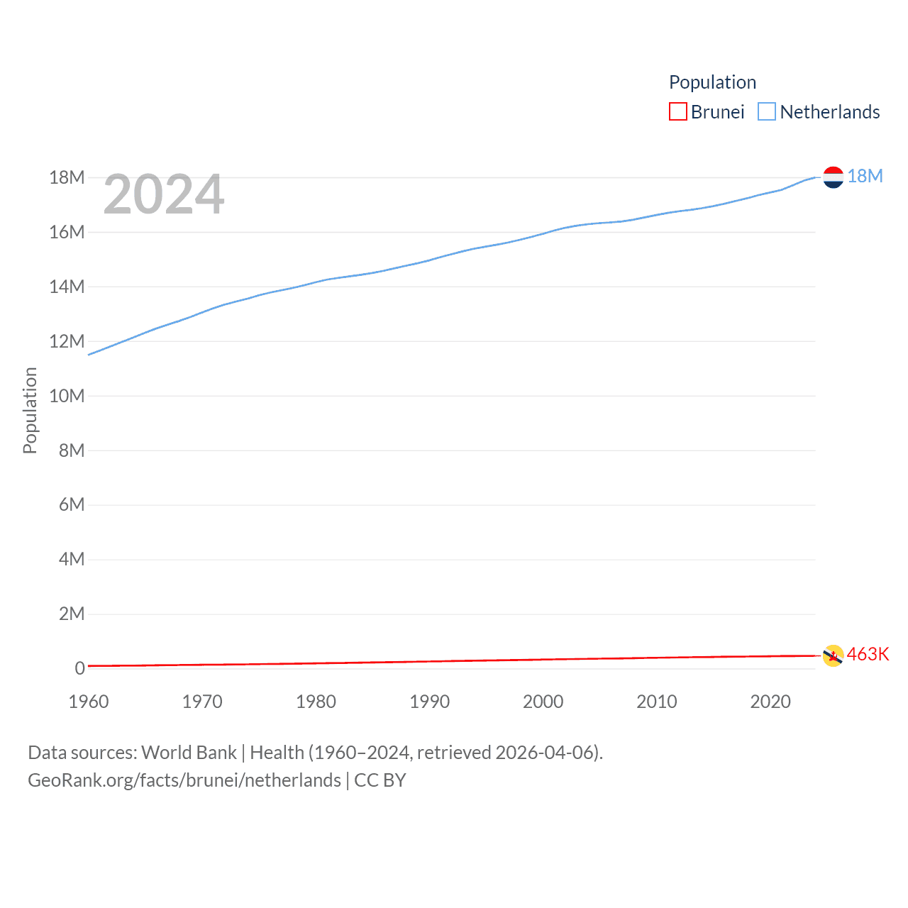 Brunei has a population of 463K (ranked 170/197), compared with 18M in The Netherlands (ranked 72/197). Brunei's land area is 2,035 sq mi versus 13,000 sq mi for The Netherlands (ranked 165th vs. 134th).
