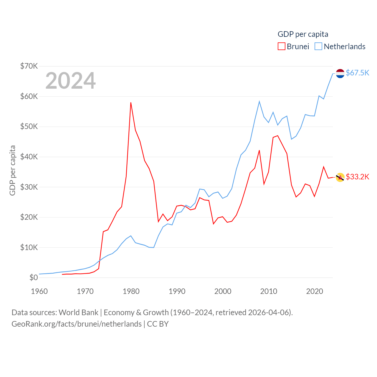By GDP, Brunei ranks 142/197 ($15.3B) and The Netherlands ranks 19/197 ($1.21T). By GDP per capita, Brunei ranks 36/197 ($33,153), while The Netherlands ranks 13/197 ($67,520).