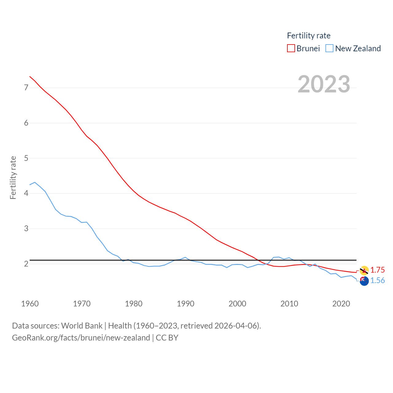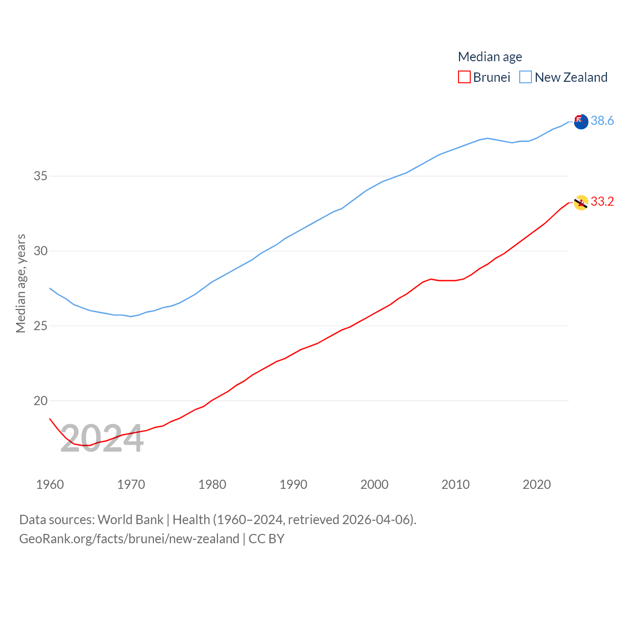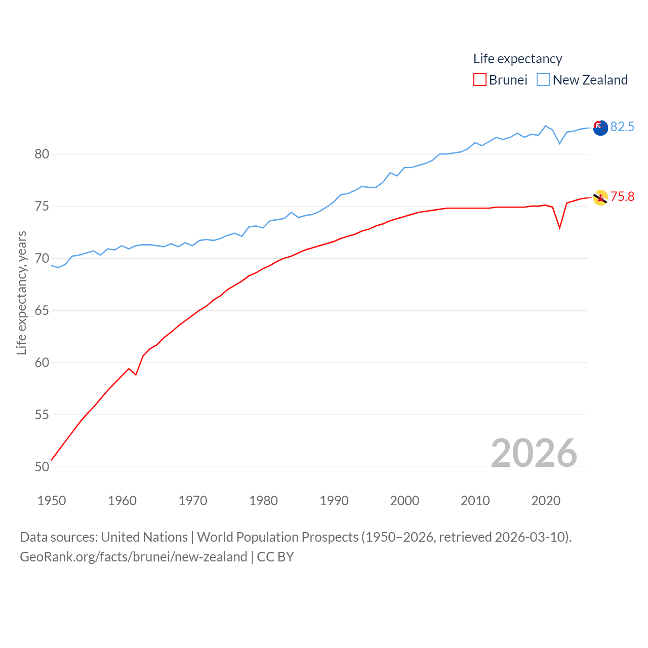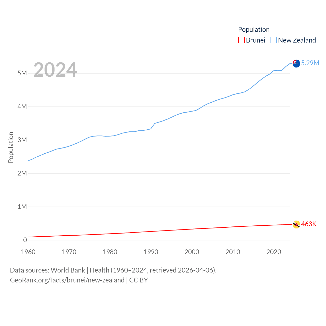 Brunei has a population of 463K (ranked 170/197), compared with 5.29M in New Zealand (ranked 123/197). Brunei's land area is 2,035 sq mi versus 101,665 sq mi for New Zealand (ranked 165th vs. 74th).