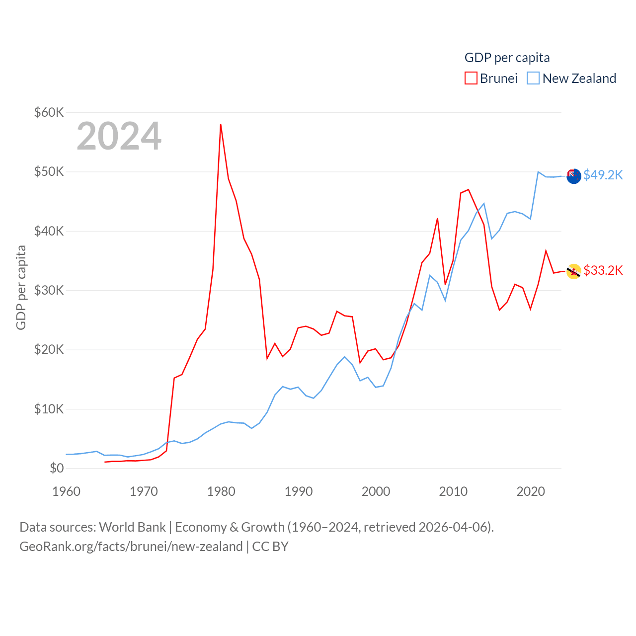 By GDP, Brunei ranks 142/197 ($15.3B) and New Zealand ranks 52/197 ($260B). By GDP per capita, Brunei ranks 36/197 ($33,153), while New Zealand ranks 26/197 ($49,205).